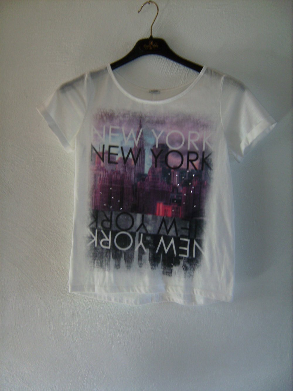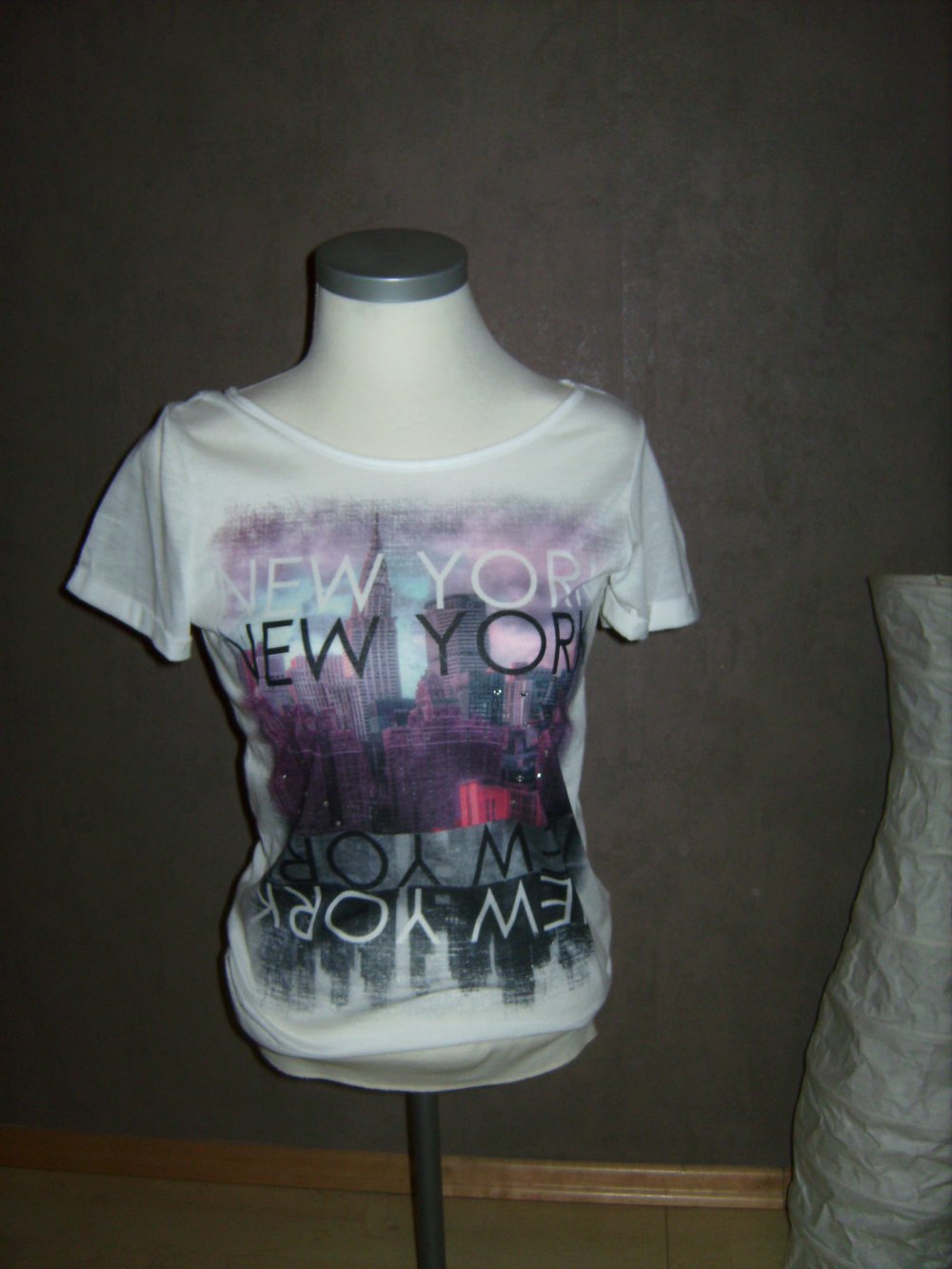 Breite 38 cm, Länge 56 cm. Schulterweite 31 cm. Pimkie Skyline New York Shirt in gepflegtem Zustand. Zu sehen an Puppentorso 36. Ausgewiesen als XS. Tragbar in 36/38. Grundfarbe weiß semitransparent. Fotoprintdruck Flieder-grau. Plus Versandkosten