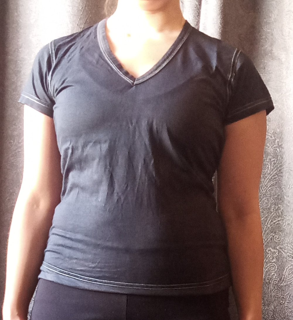 Schwarzes T-Shirt von H&M, Größe M fällt aber eher aus wie S. Die Nähte sind weiß abgesetzt, kleiner Fleck am rechten Arm. Getragen bis auf den Fleck in gutem Zustand