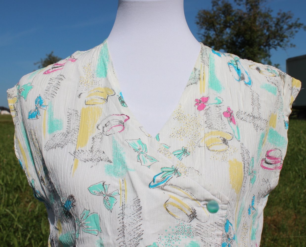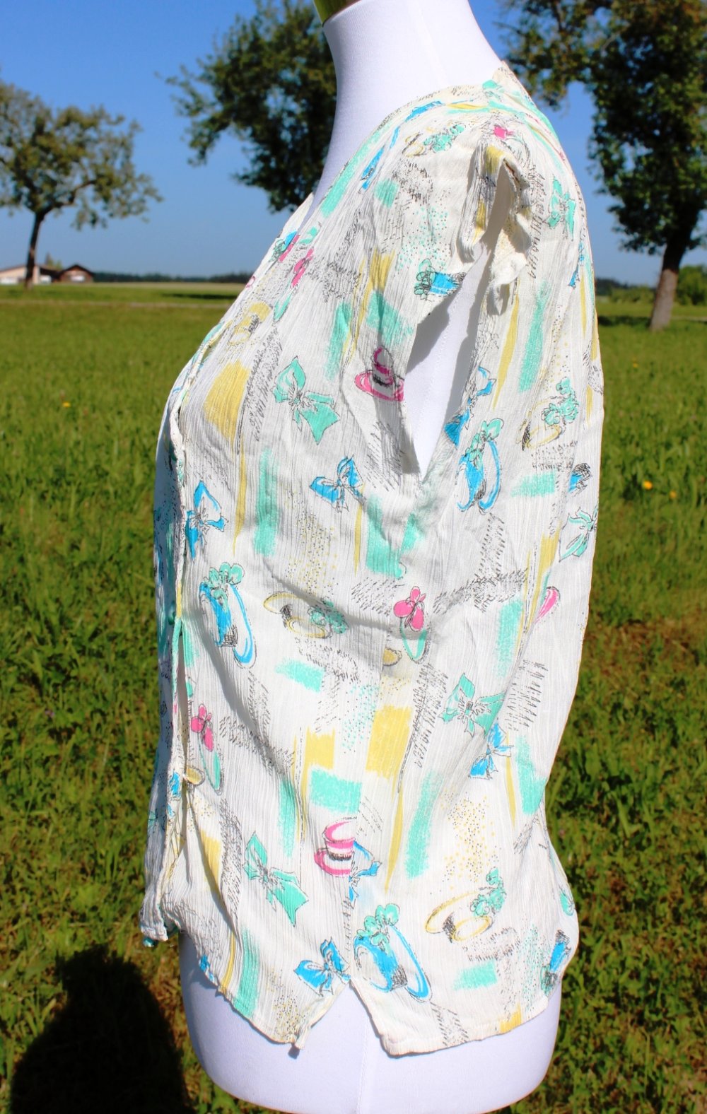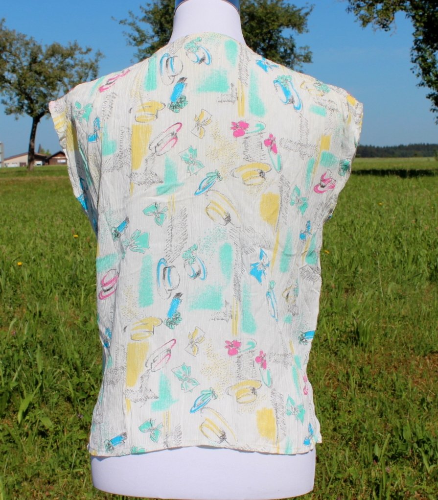 weißes True Vintage Top mit Sonnenhüten, Schleifen und Blumen, Größe 36-40, Unikat