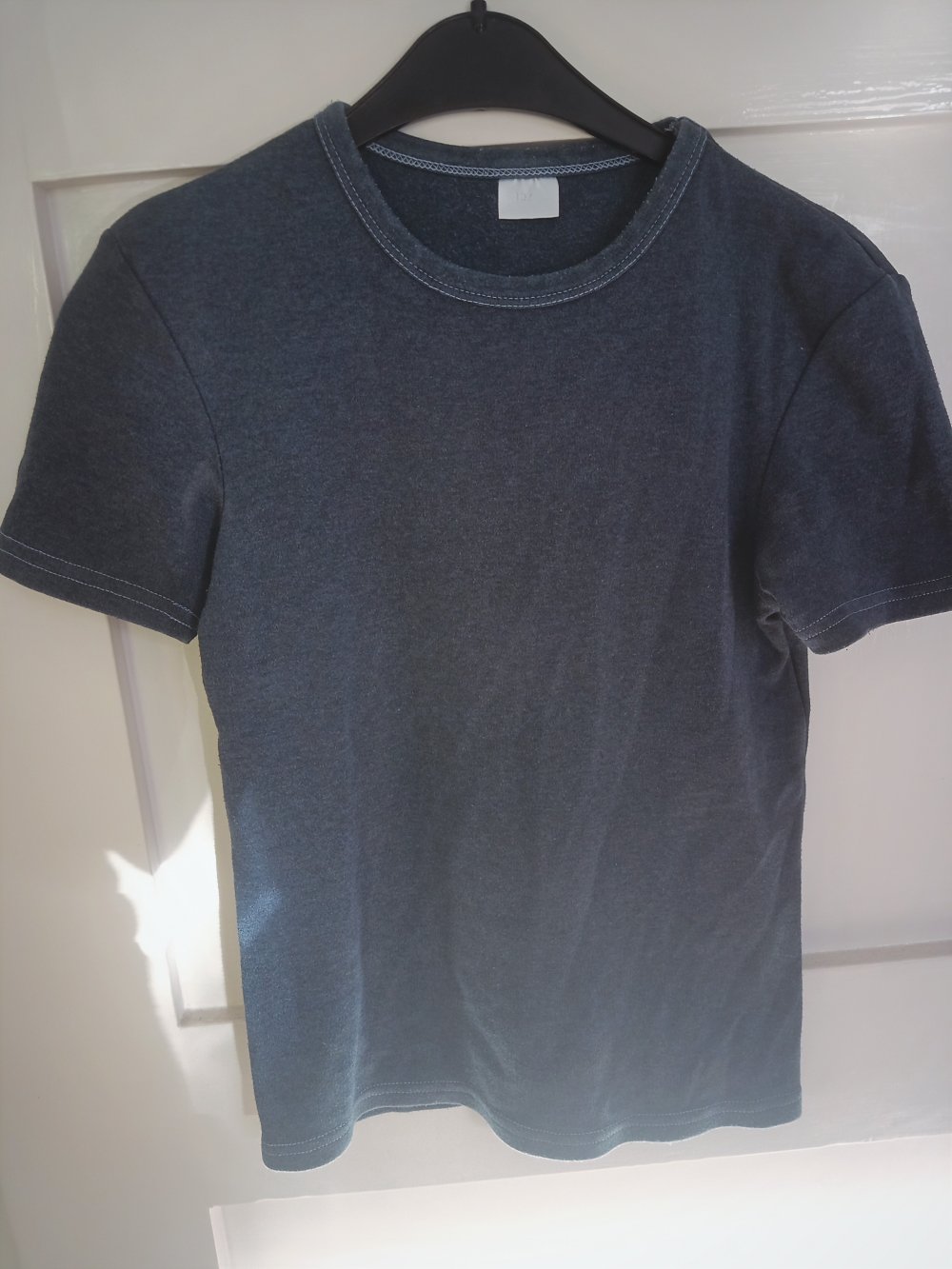 kuscheliges blaues kurzärmeliges T-Shirt in Größe 152, auch mit XS oder S tragbar. Gerne getragen gerade im Winter weil es wirklich sehr gut wärmt. Dicker Stoff, innen sehr kuschelig, leider auch mit Pilling (siehe Bild).