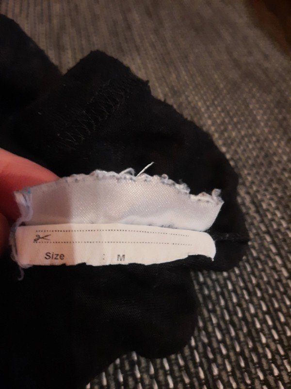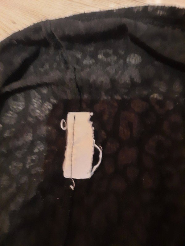 Pflegehinweisschild bzw. Markenschild herausgeschnitten, siehe Bild. Vereinzelt Löcher auf der Rückseite, siehe Bild.