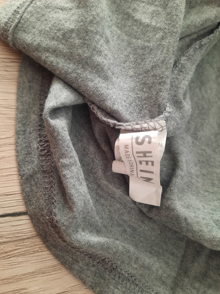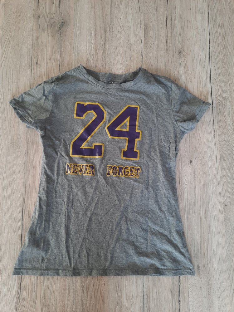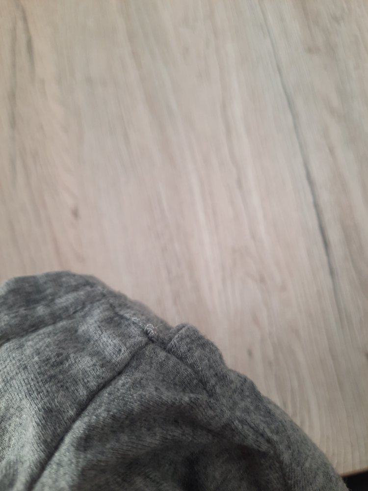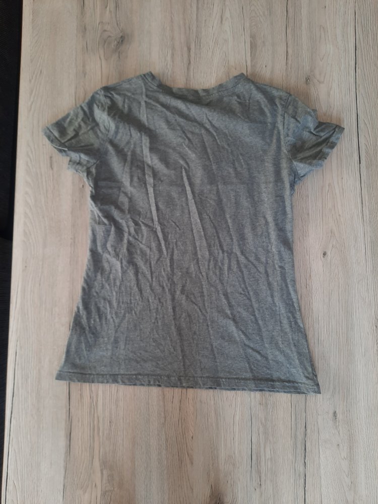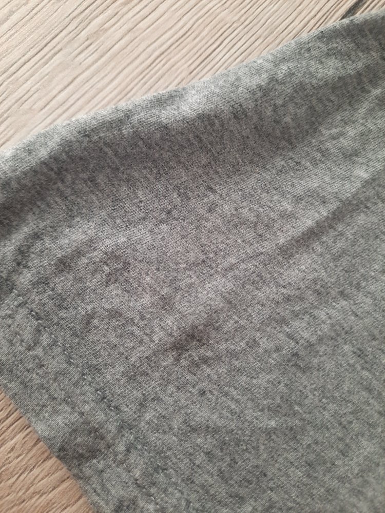 Dunkler Fleck auf der Vorderseite unten, siehe Bild. Nähte unter rechter Achsel kommen raus, siehe Bild. Aufdruck hat an ein paar Stellen weiße Punkte. Ansonsten guter Zustand.