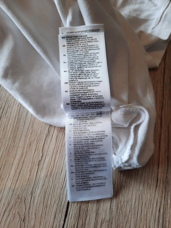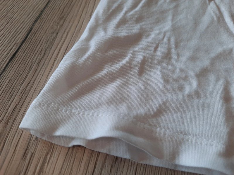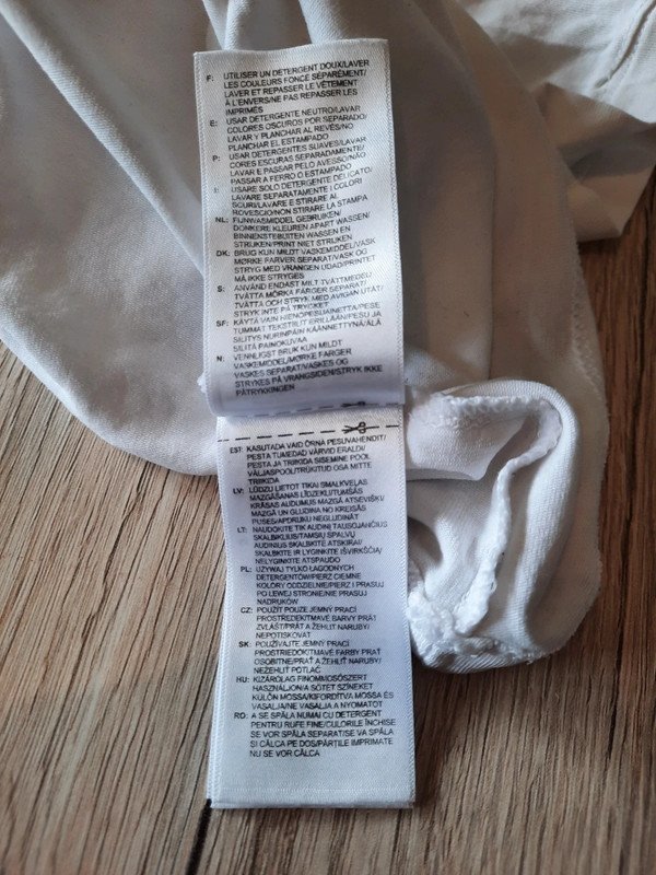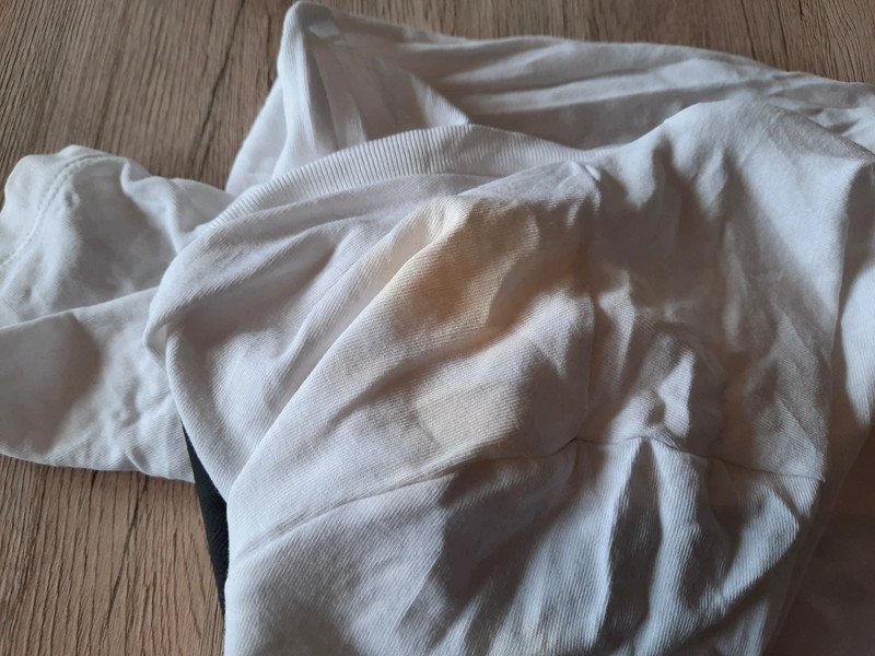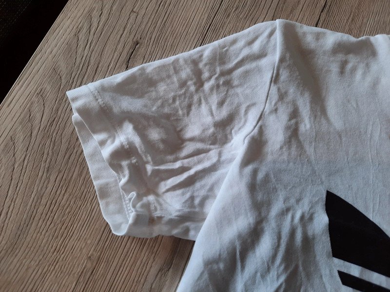 Pilling an mehreren Stellen. Aufdruck schon etwas rausgewaschen. Großer gelber Fleck auf der linken Seite am Ärmel/Kragen.