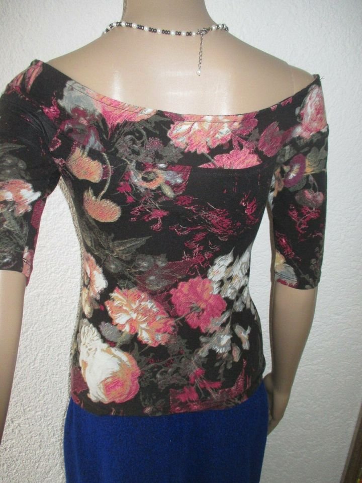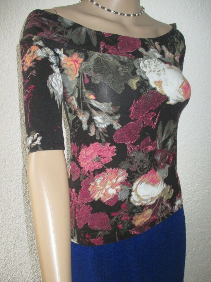 NEU * Nostalgie * Romantik * Rosen * Blumen * Blüten * Flower- Power * Bodycon * Carmen * T- SHIRT "RIVER ISLAND" Gr. 36- 38/ S * schwarz * dunkel- bordaux- rot * grün * beige * Pastell *