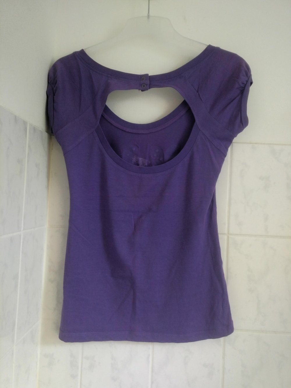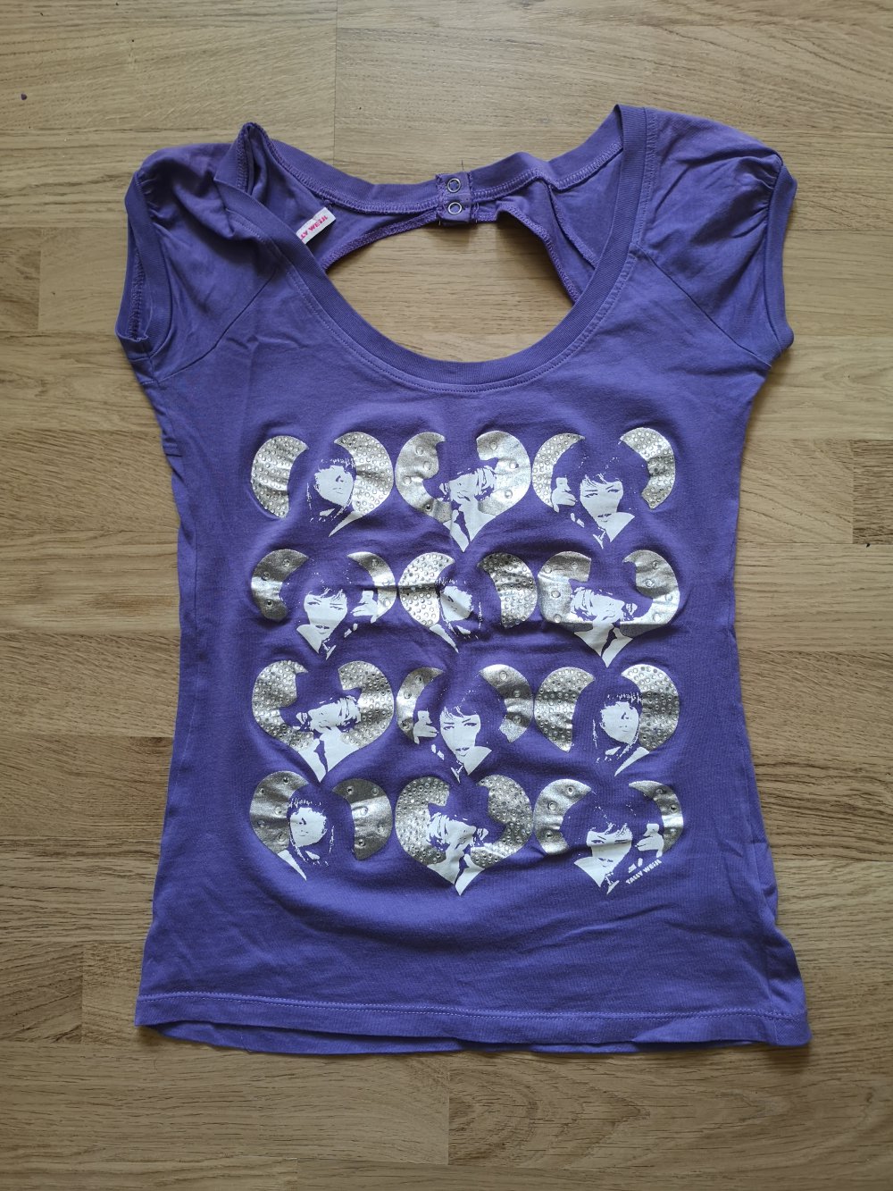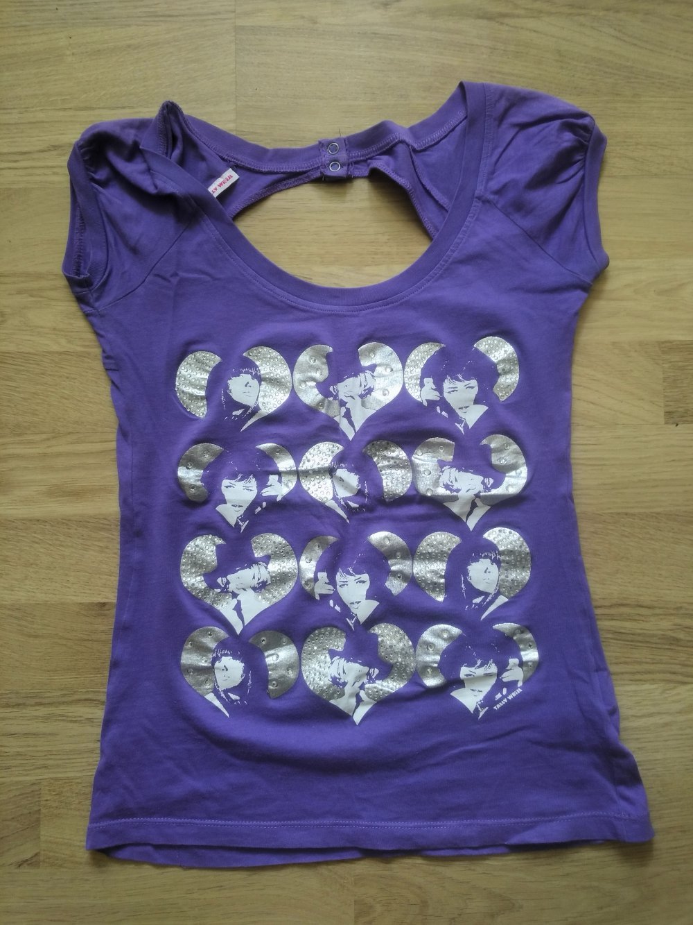 Dieses supercoole lila Shirt ist ein einziger Hingucker - vorne mit silbernem Print, hinten mit Rückenausschnitt