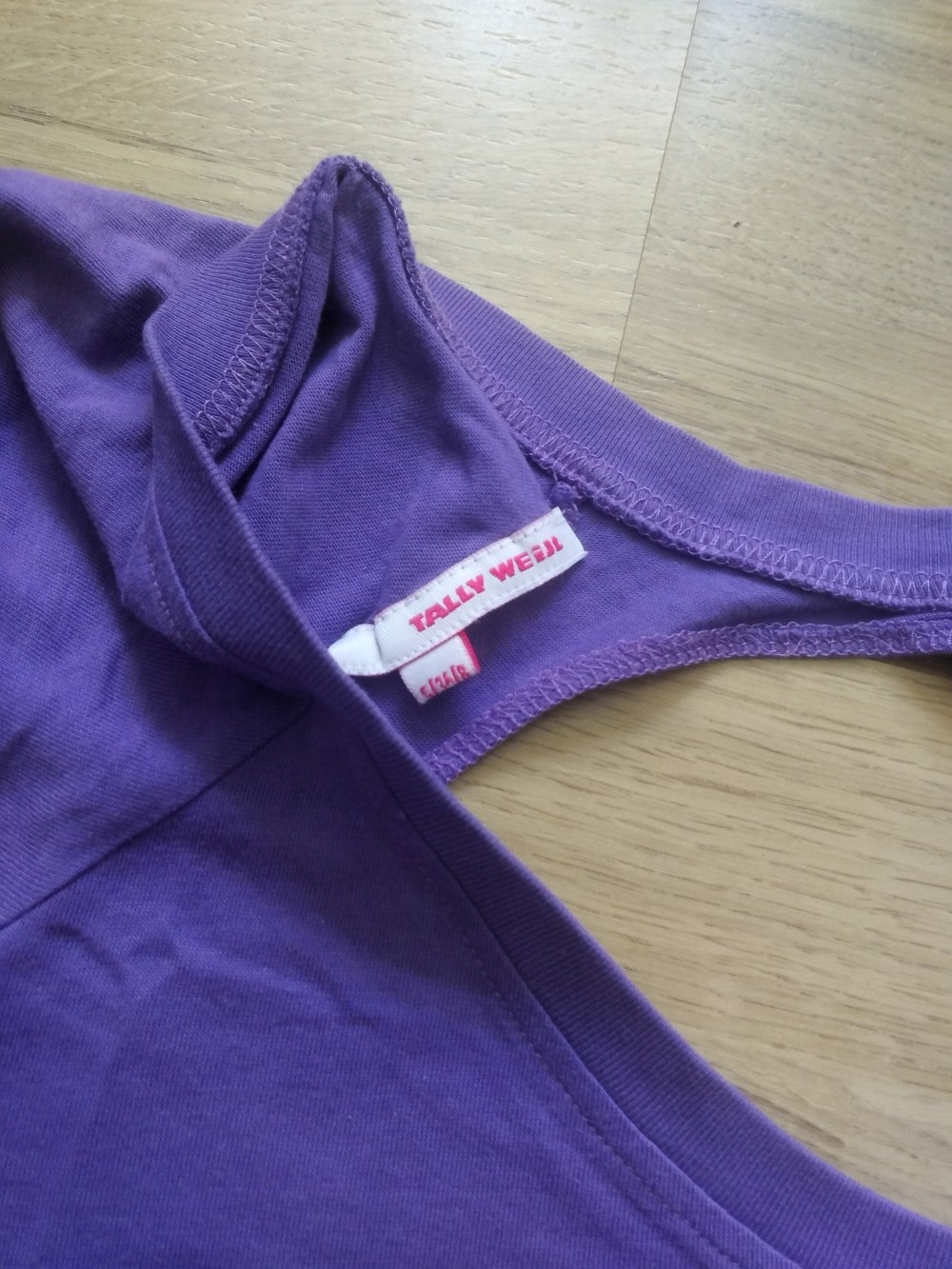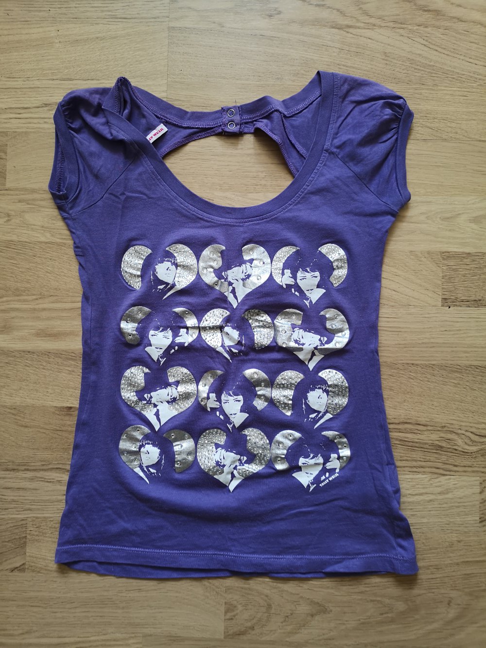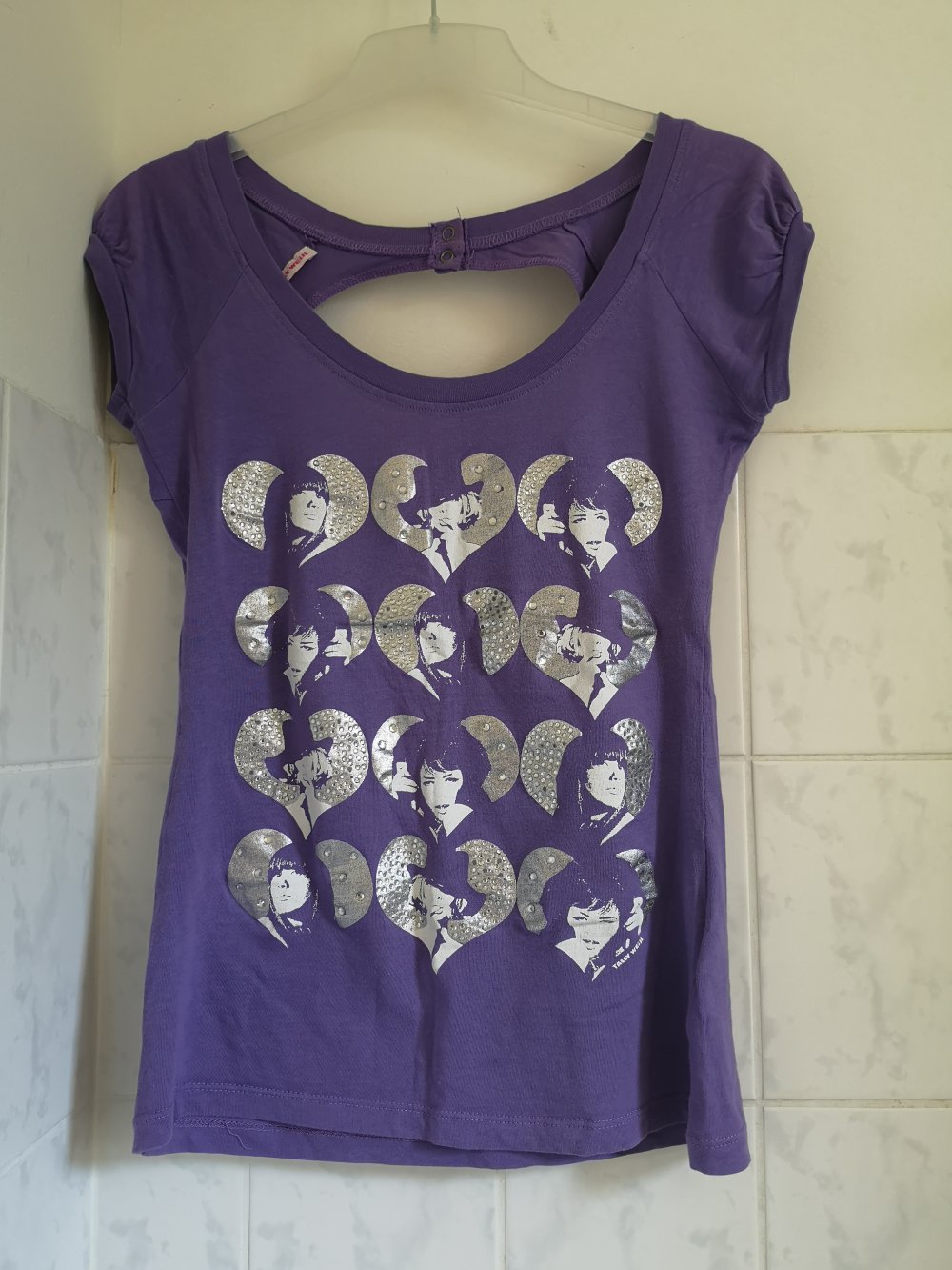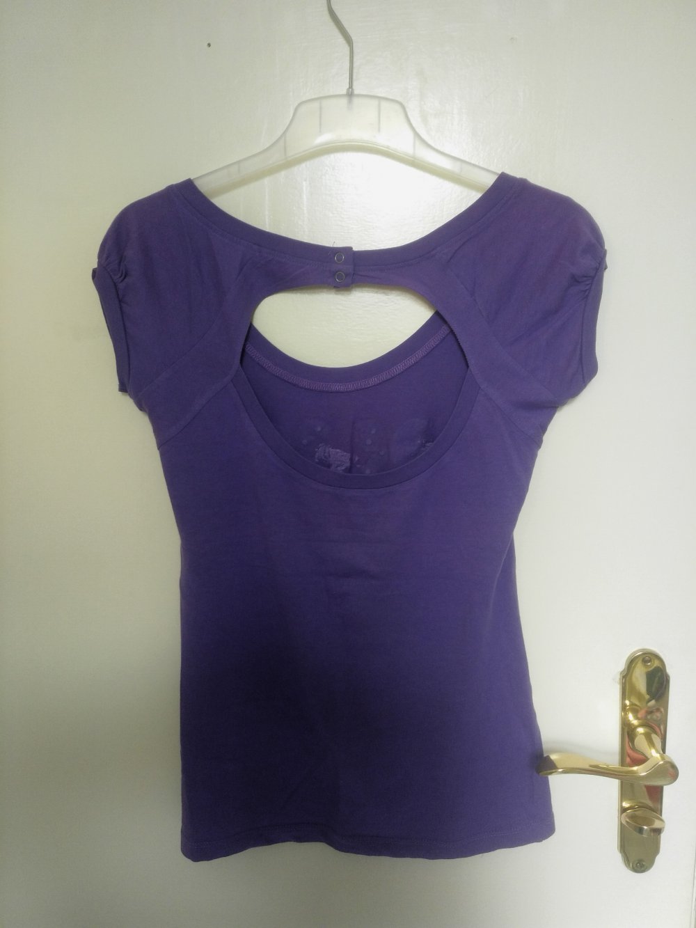 Dieses supercoole lila Shirt ist ein einziger Hingucker - vorne mit silbernem Print, hinten mit Rückenausschnitt