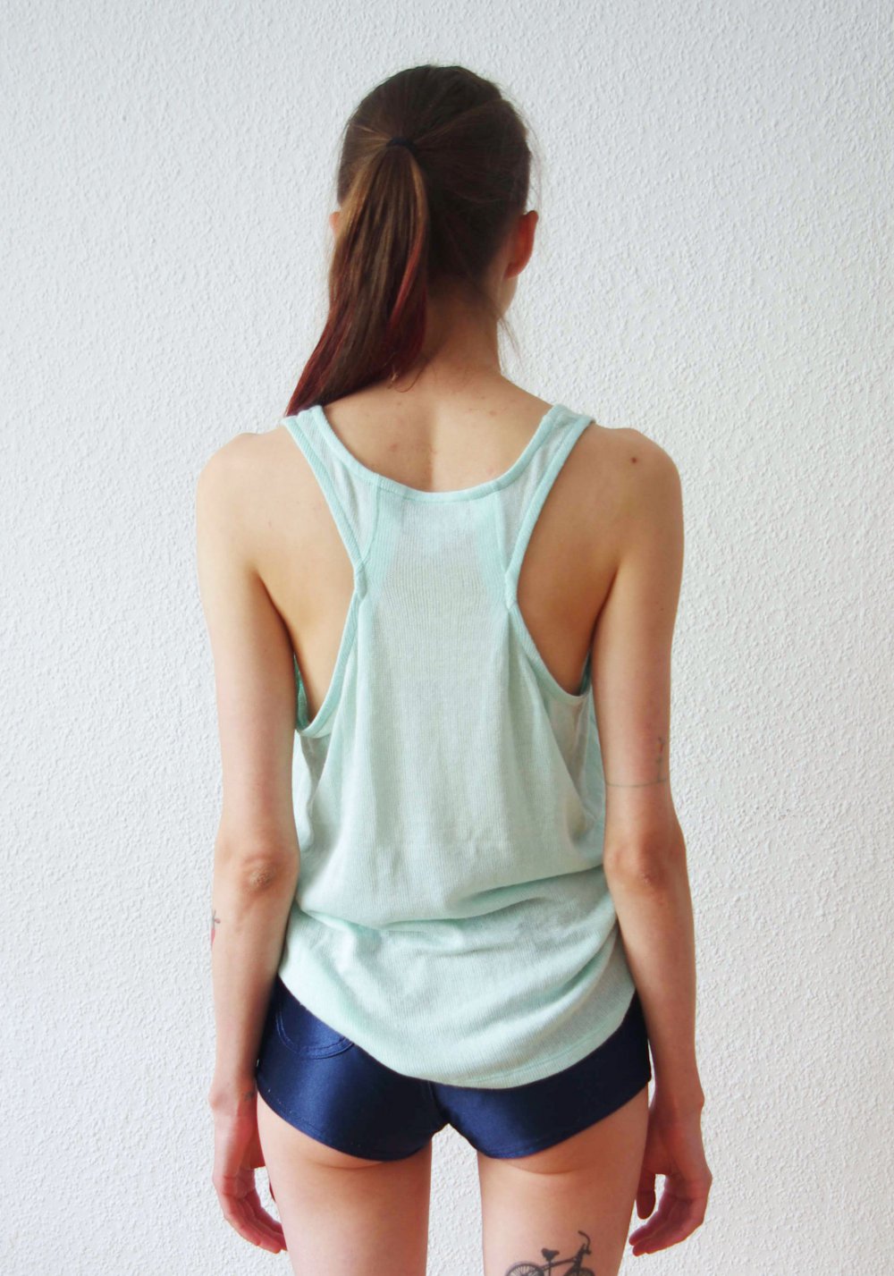 Eigenschaften: großartiges gestricktes Tanktop, leicht oversized, luftig-leichter sommerlicher Stoff mit Racerback, gerader bzw leicht ausgestellter Schnitt, stretchig, ärmellos, einlagig - großartig für Party, Alltag, Rave, Festival & Strand und natürlich jeglichen Sport wie Fitness, Yoga etc