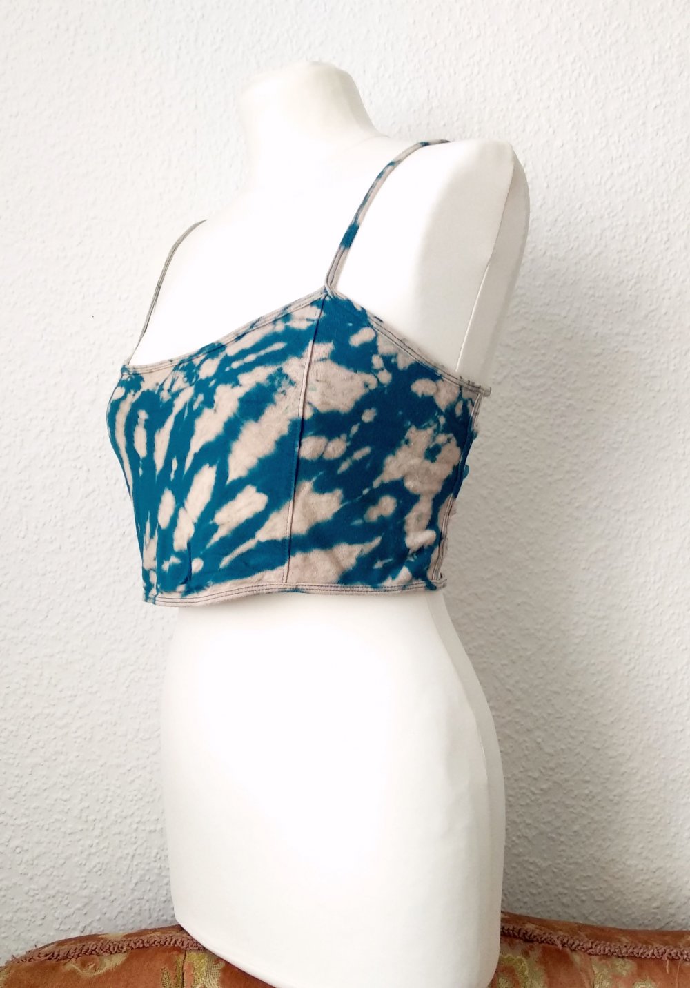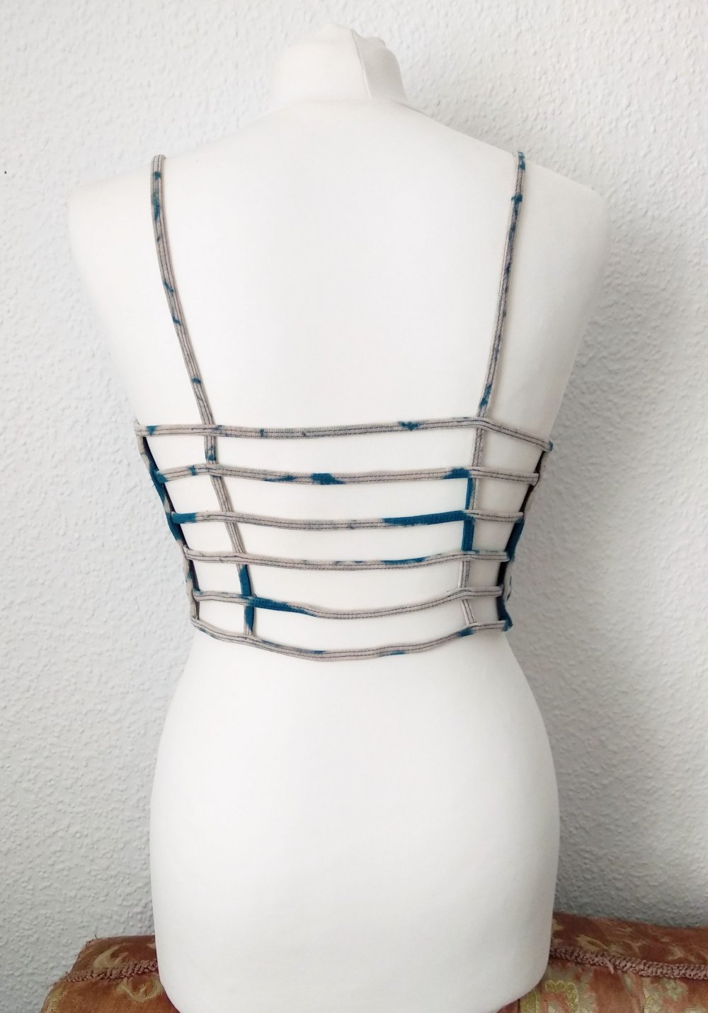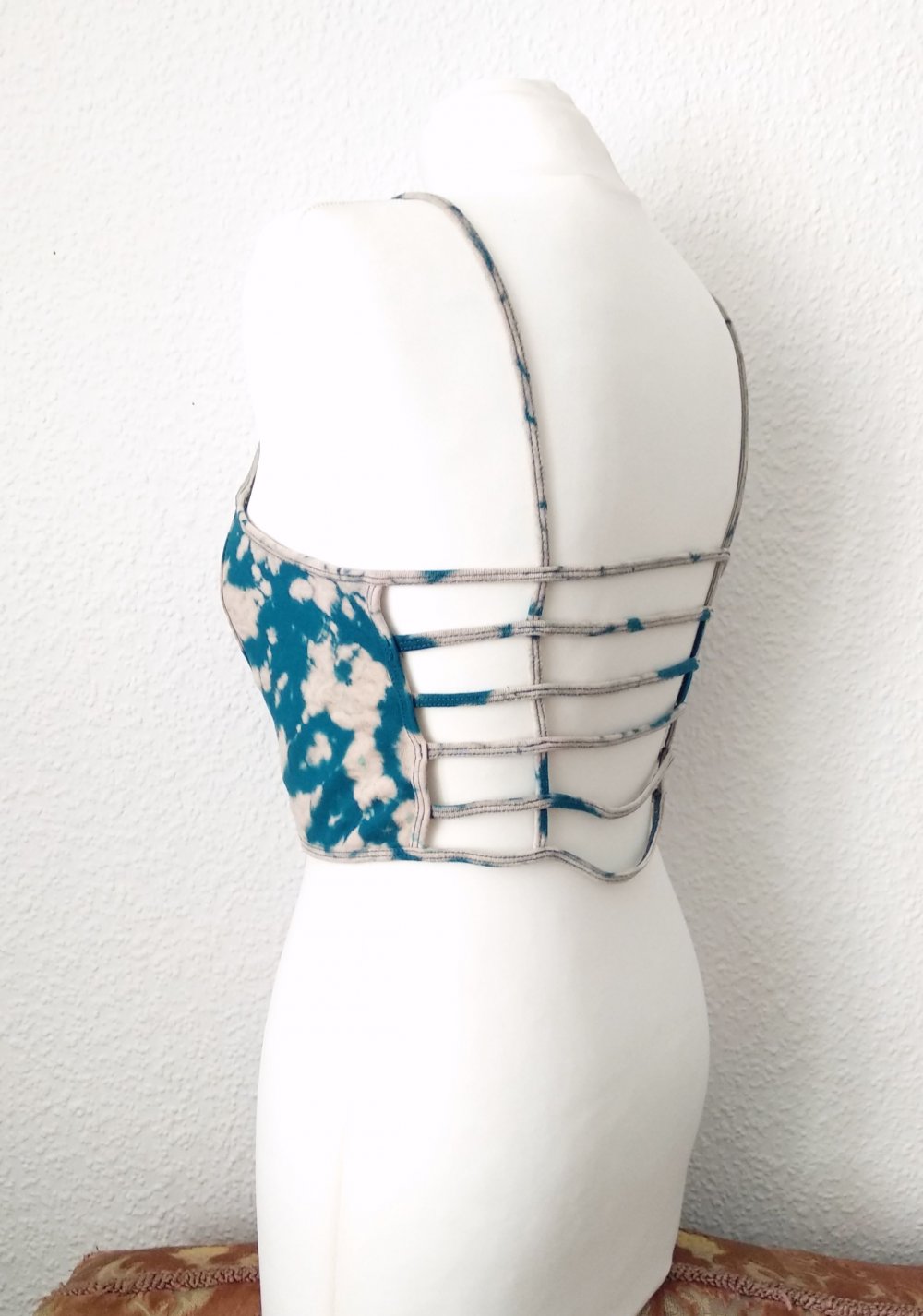 Eigenschaften: cooles strappy Bralet/Bandeau-BH/Croptop/Bustier, mit Batik/Bleach-Muster, dünne nicht verstellbare Spaghettiträger, zum Reinschlüpfen, super stretchiger Jerseystoff, vorderer Part ist doppellagig, hinterer mit Cutouts - großartig für Party, Alltag, Rave & Festival, Strand usw
