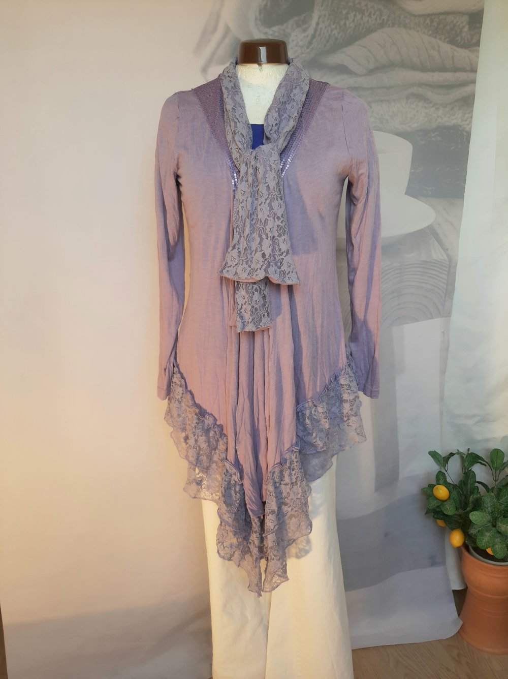 Der Schalkragen ist abnehmbar. Die Jerseyqualität der Tunika ist weich und angenehm zu tragen. Materialinfo: Viscose-Mix. Gröfeninfo: 38/40 Länge HM ca. 74 cm. Versand als Maxibrief. Für anderen Versand gerne melden.