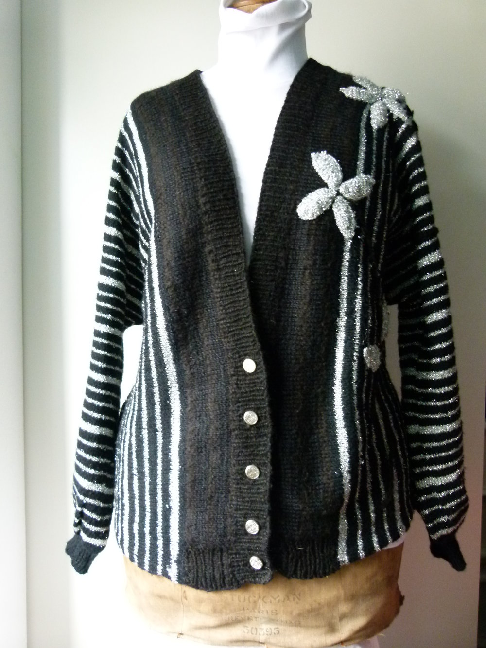 Strickjacke Cardigan, Handarbeit, schwarz silber mit Streifen und Blütenmuster, Unikat, Boho Mori Retro Vintage