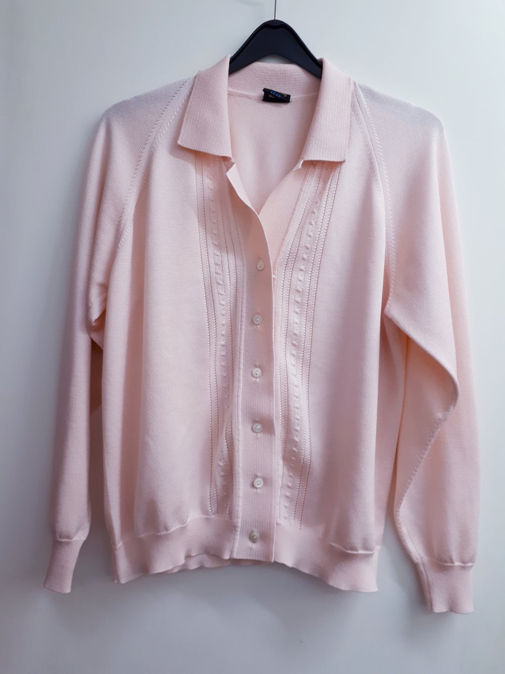 Rosane Echtvintage Strickjacke mit dezentem Muster.