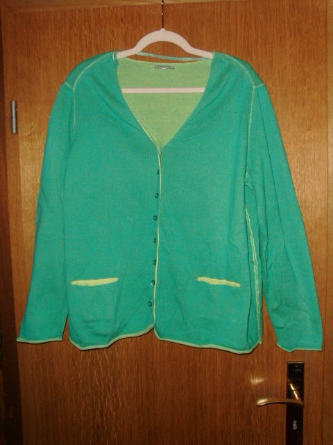 Biete hier einen Cardigan von Gina Laura in Größe XL( 48/50 )an. Die Farbe ist so ein türkis-grün, kräftiger wie auf den Fotos, innen ist er hellgrün abgesetzt und er besteht aus 100% Baumwolle. Vorn befinden sich eine durchgängige Knopfleiste und zwei kleine Taschen. Die Taschen sind noch verschlossen und an der Jacke befindet sich noch ein Tütchen mit einem Ersatzknopf. Die Jacke ist neu und ungetragen, hing nur im Schrank.