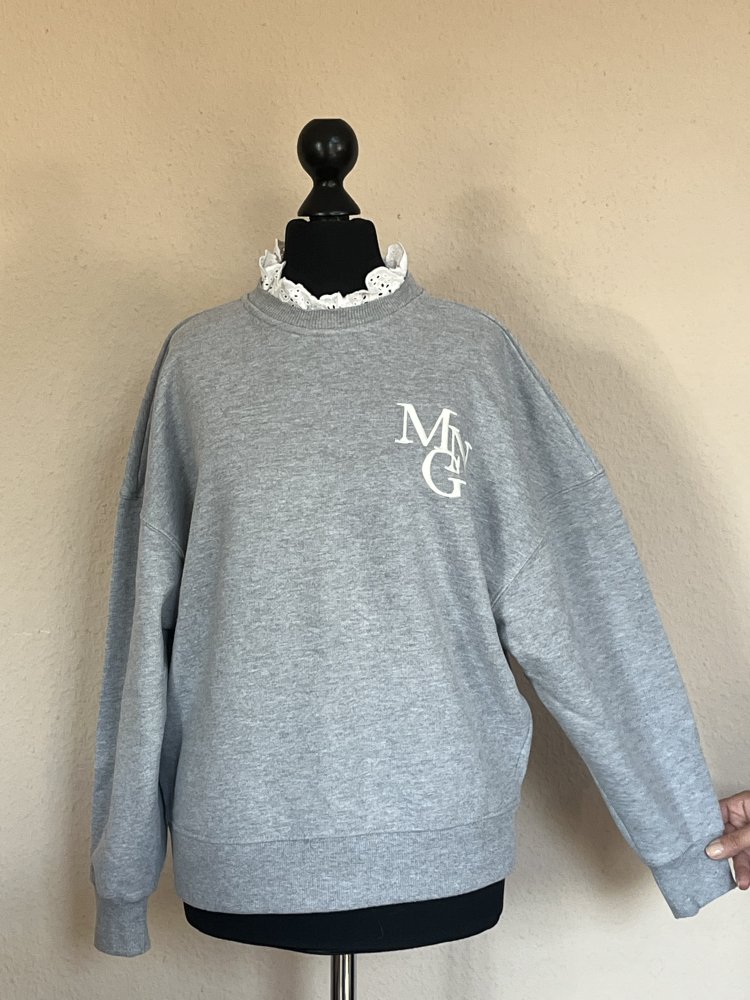 MNG Mango Basic Sweatshirt mit weißem Kragen Gr.S hellgrau, kleiner Rücken Cut Out, MNG Logo weiß gestickt auf der rechten Brust