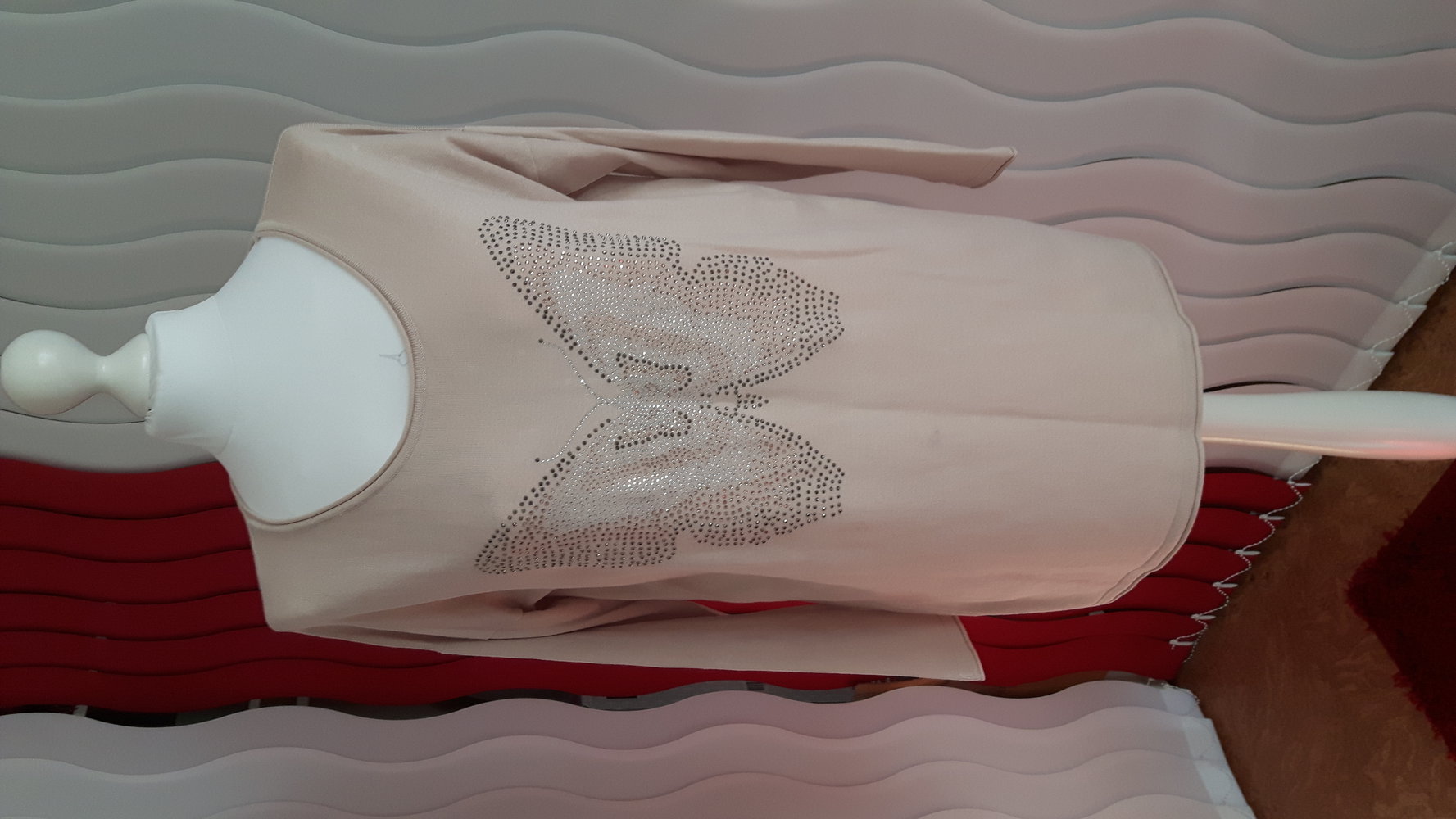 Hübscher leichtstrick Longpullover in beige. Auffällig schön ist die Vorderansicht aus verschiedenen farbigen kleinen Nieten gearbeitet. Zu dieser Jahreszeit, kombiniert mit einem Loop oder Strickschal, genauso gut zu tragen, wie an nicht so warmen Sommertagen.