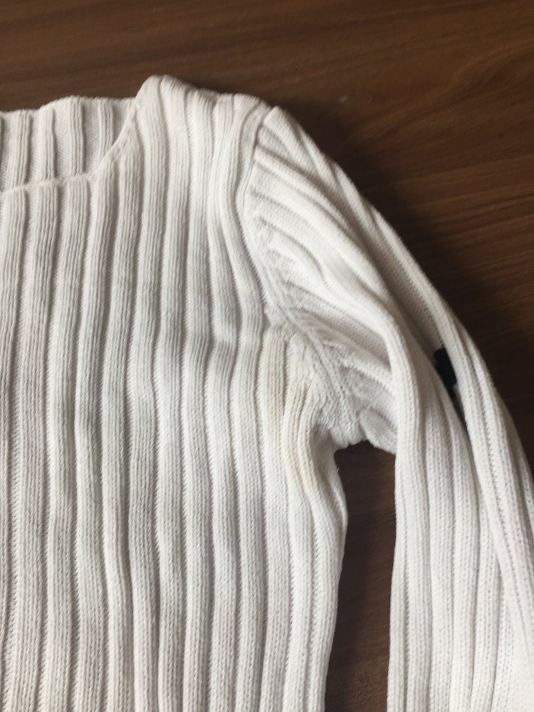 Weißer Pulli mit U-Boot-Ausschnitt. Leider fehlt das Größenschild. Sollte aber Gr. 38/40 sein. Hatte den Pullover selbst getauscht. Hat leider auf der linken Seite gelbliche Flecken (lag länger im Schrank). Gerne als Gratisartikel bei Kauf oder Tausch hinzu oder gegen Übernahme der Versandkosten.