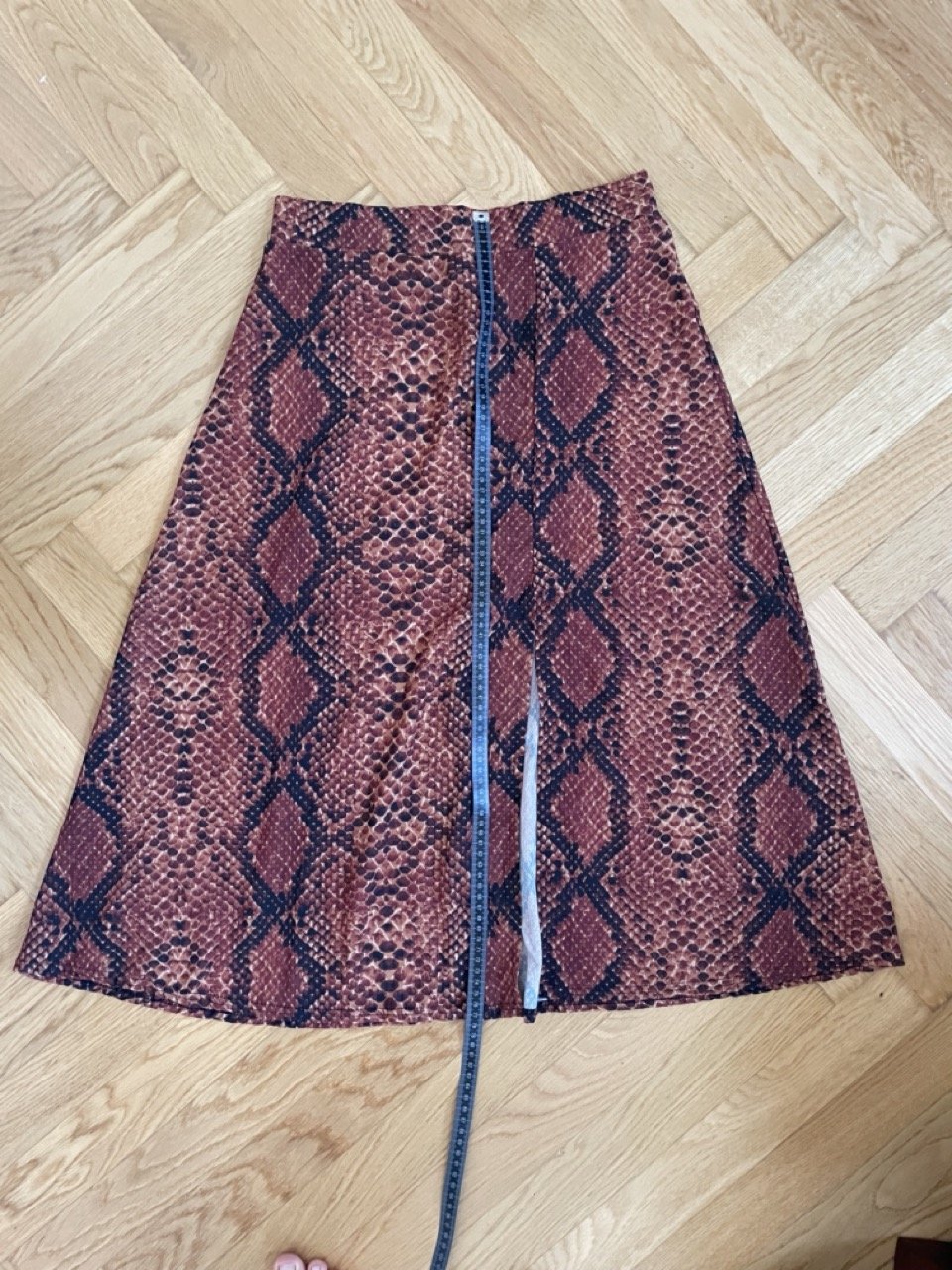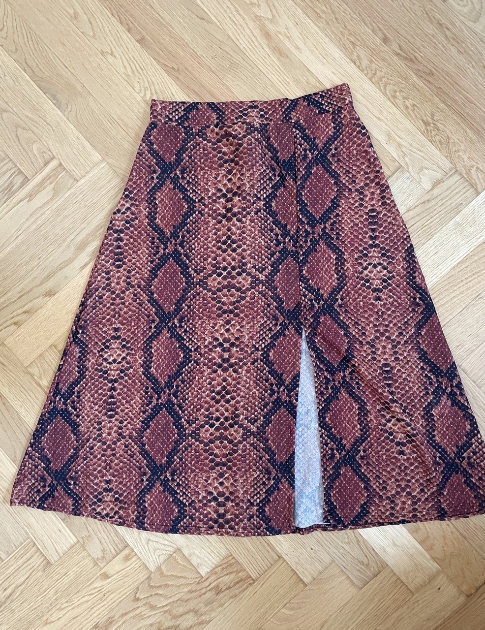 Neuer Midirock mit Schlangenmuster in kräftigem Orange/Braun/Schwarz. Der Rock ist an einer Stelle geschlitzt, der Stoff ist leicht und fällt fließend. Bisher hat er leider nur im Schrank gelegen und wartet auf den ersten Auftritt!