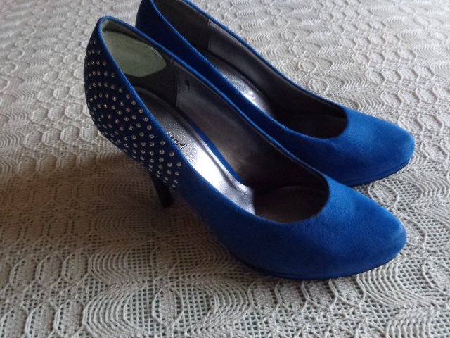 hübsche Pumps, Gr. 39, Graceland, royalblau, wildlederartig, an den Außenseiten sind hinten Nieten, einige Male getragen, normale Abnutzung, Absatzhöhe außen ca. 11 cm, innen ca. 8 cm, normale Abnutzungsspuren, am rechten äußeren Sohlenrand dunkle Stelle, 21,00 Euro, Versand 5,00 Euro möglich, zeitnahe Antwort,