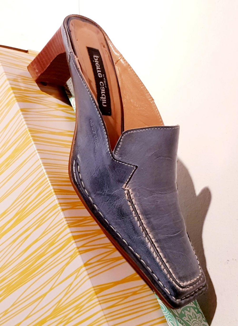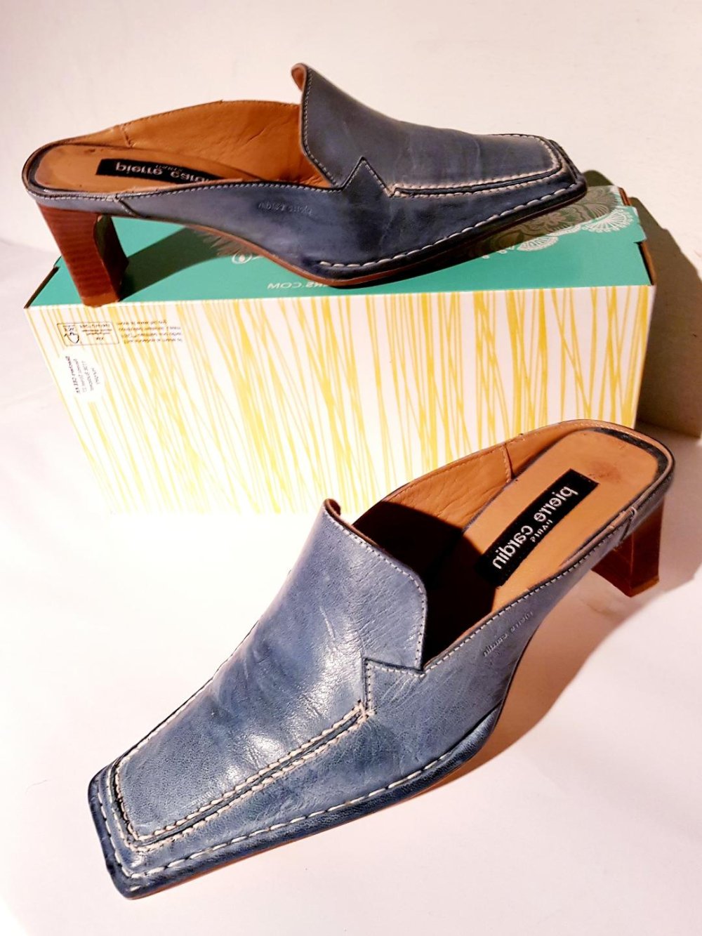 Biete Schuhe / High Heels Sabots ( Pantolette) von Pierre Cardin- Paris, Größe 38 in der Farbe Jeans-hellblau echt Leder ganz weich und bequem.