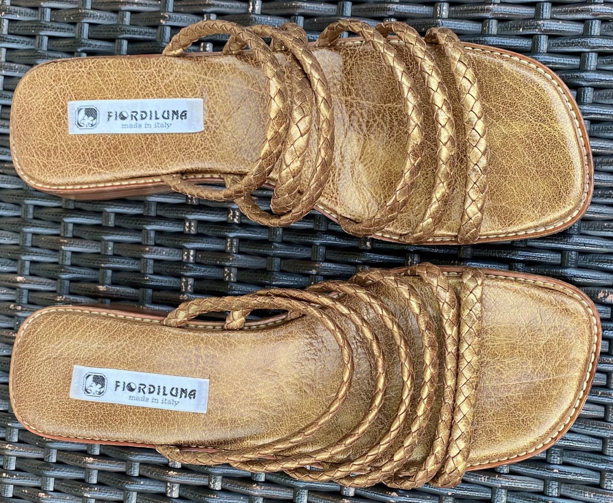 Exklusive Damen-Sandalen der Marke Fiordiluna, handgefertigt in Italien. Hochwertiges Echtleder in edlem Gold-/Bronze-Ton mit mehreren geflochtenen Riemchen – ein stilvoller Hingucker mit mediterranem Flair.
