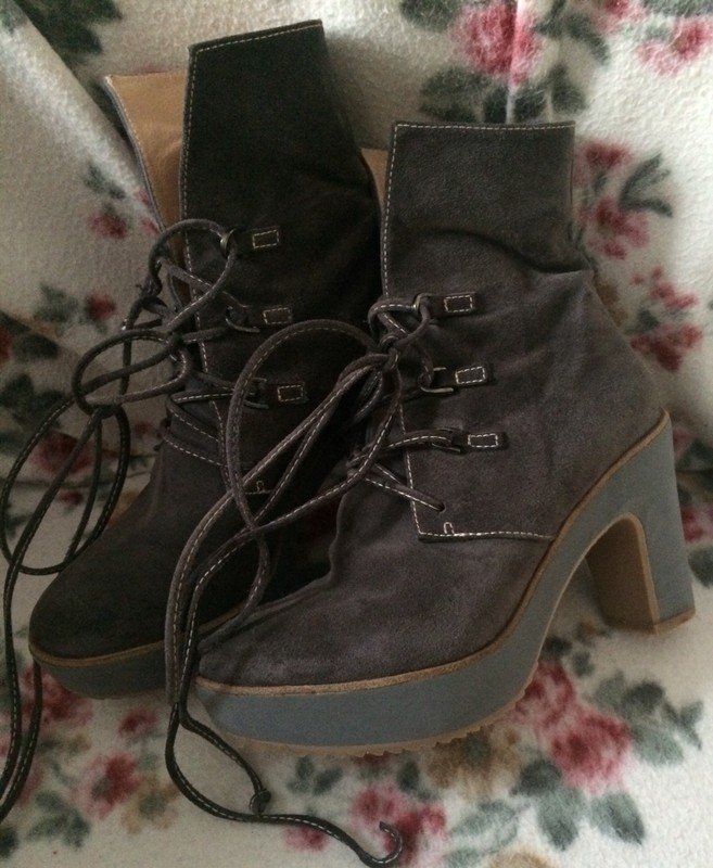 In steingrauem/ schokograuem Wildleder, Innensohle und Fußbett aus hochwertigem Glattleder, aufwendig bezogene Platteau- Absätze und Lederschnürrsenkel.