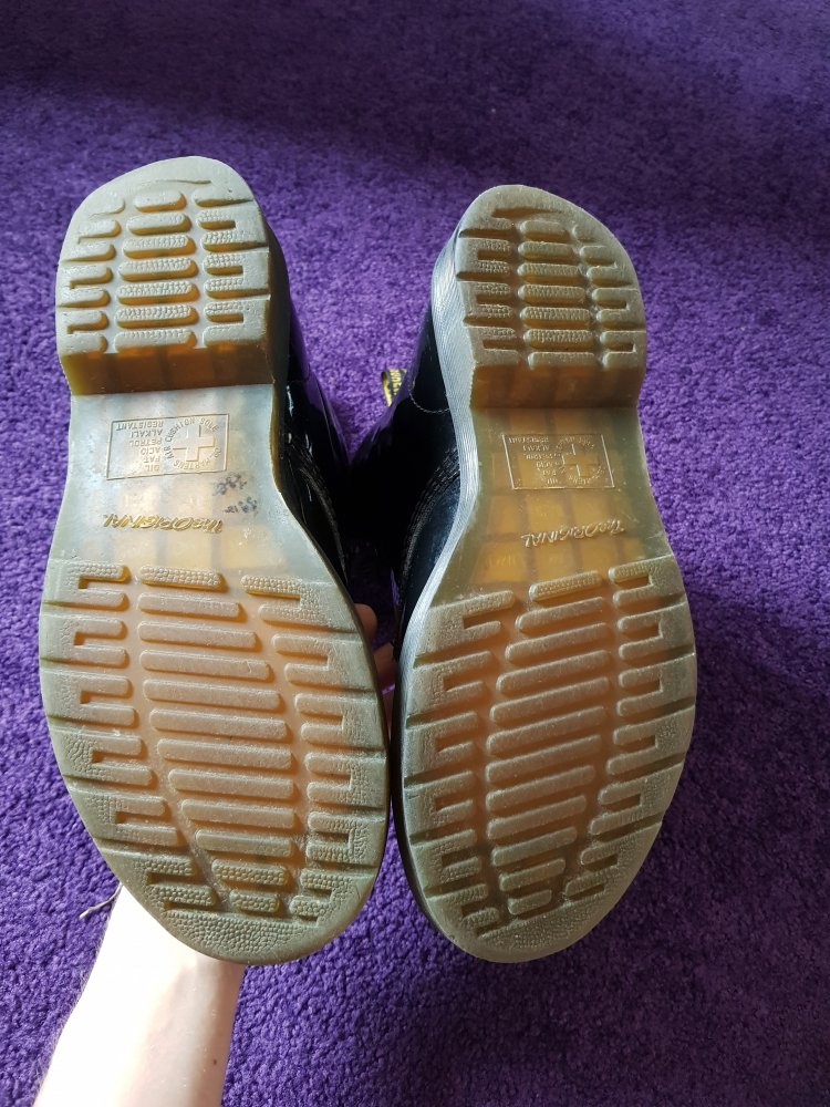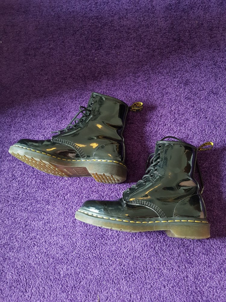 Die Dr. Martens Lacklederstiefel sind in einem guten getragenen Zustand, wie an der charakteristischen, für Füße so gesunden Sohle oder Schnürsenkeln usw. zu sehen ist. Auch das Lackleder ist in einem guten, getragenen Zustand, hat jedoch vereinzelte Unebenheiten bzw. einzelne Stellen wo die Beschichtung nicht mehr da ist. Das habe ich versucht auf den Fotos einzufangen. Wenn du da noch Fragen hast, melde dich gerne.