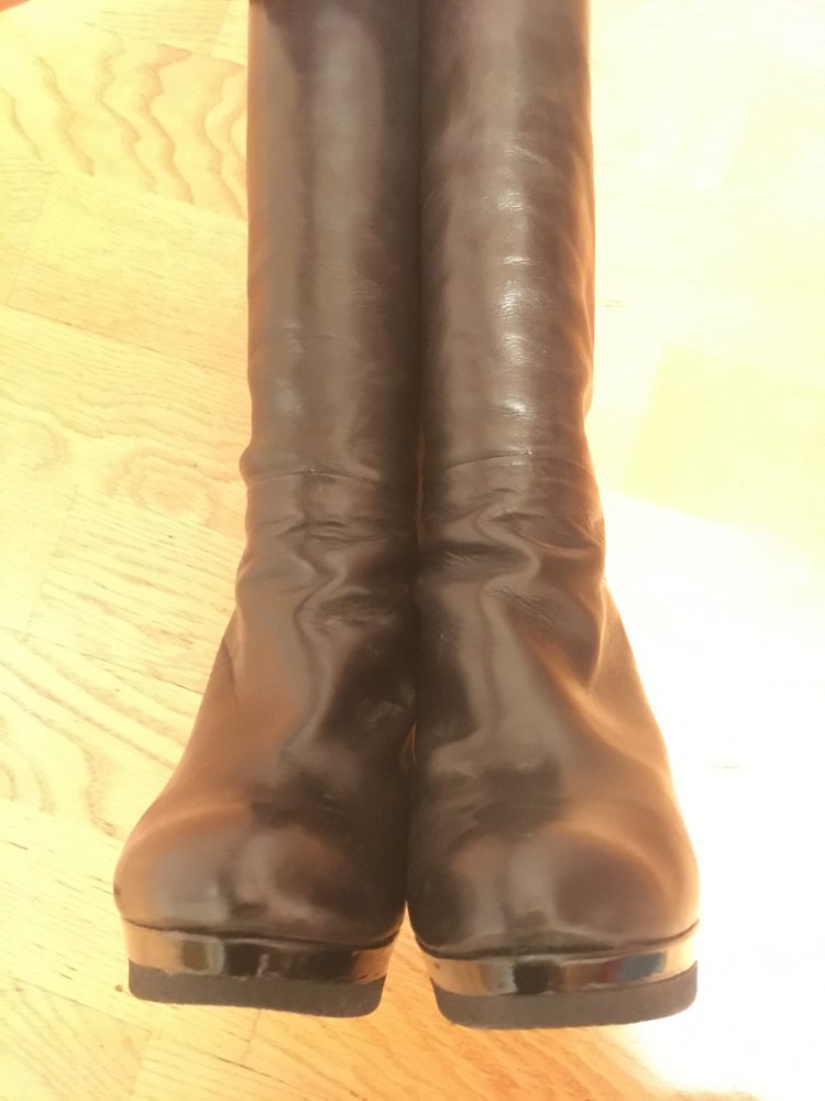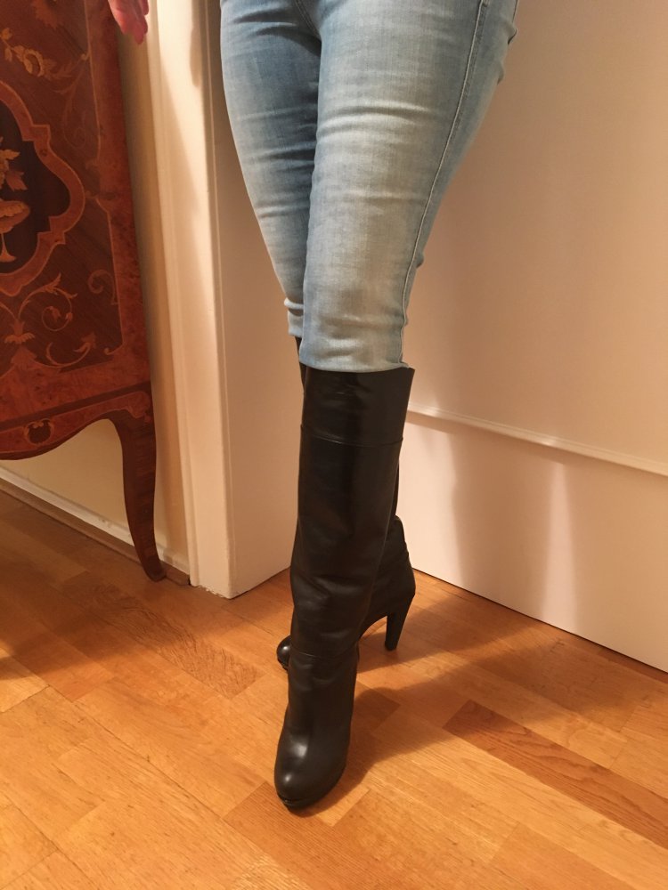 Größe 36, Absatz 10 cm, Schaft endet kurz unter dem Knie.