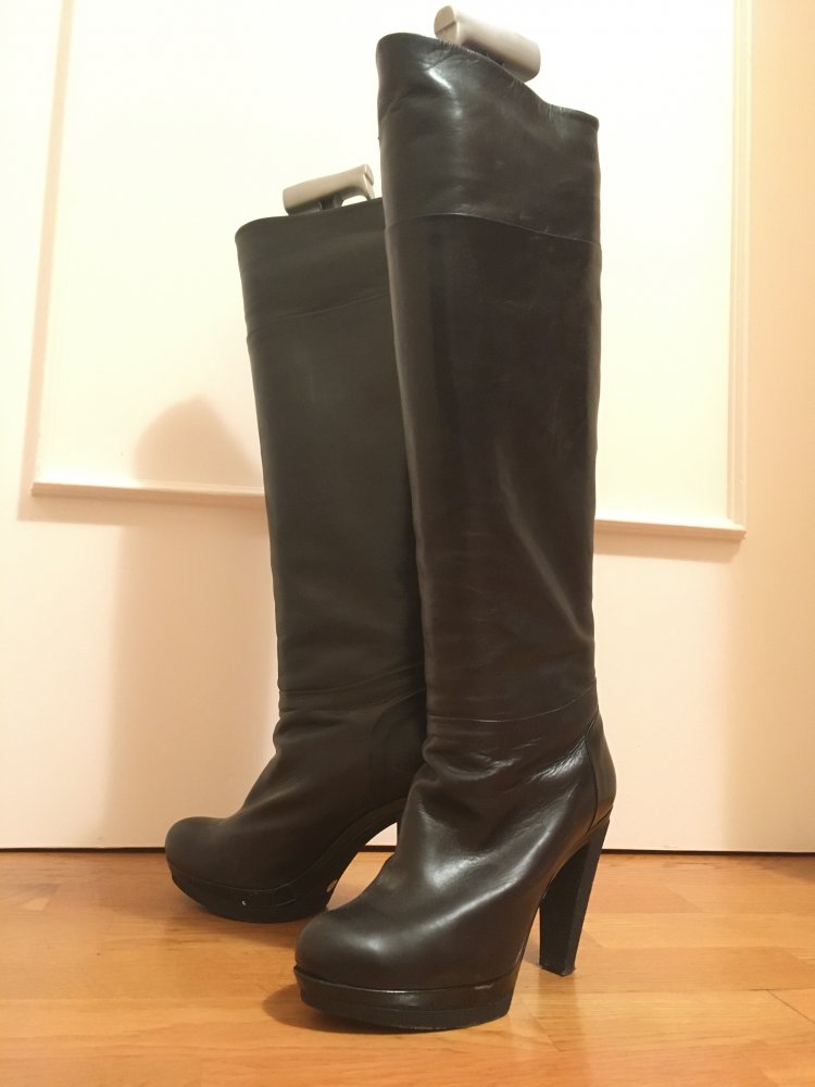 Schwarze italienische Designer Stiefel mit 10 cm Absatz kniehohem Schaft aus Glattleder, Gr. 36