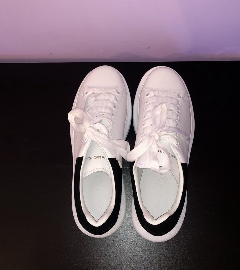 Diese klassische Kollektion kommt in einer monochromen Version der ikonischen Zwischensohlen-Sneaker des Labels mit einer breiteren, vorstehenden Sohle. Der Designer entschied sich bei diesem Paar für weißes, mattes Glattleder. Der Absatz hat ein Obermaterial aus schwarzem Samt und Wildleder mit dem in Gold geprägten Logo der von Alexander McQueen gegründeten Marke.