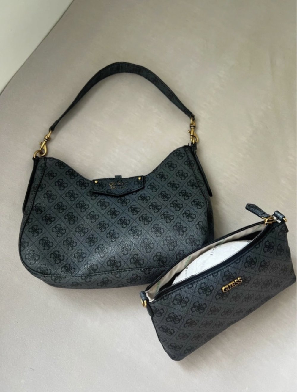 Hier wird ein hochwertiges 2er Taschenset der Marke GUESS in einem stilvollen Grau angeboten. Das Set besteht aus einer großen Handtasche und einer passenden kleinen Innentasche.