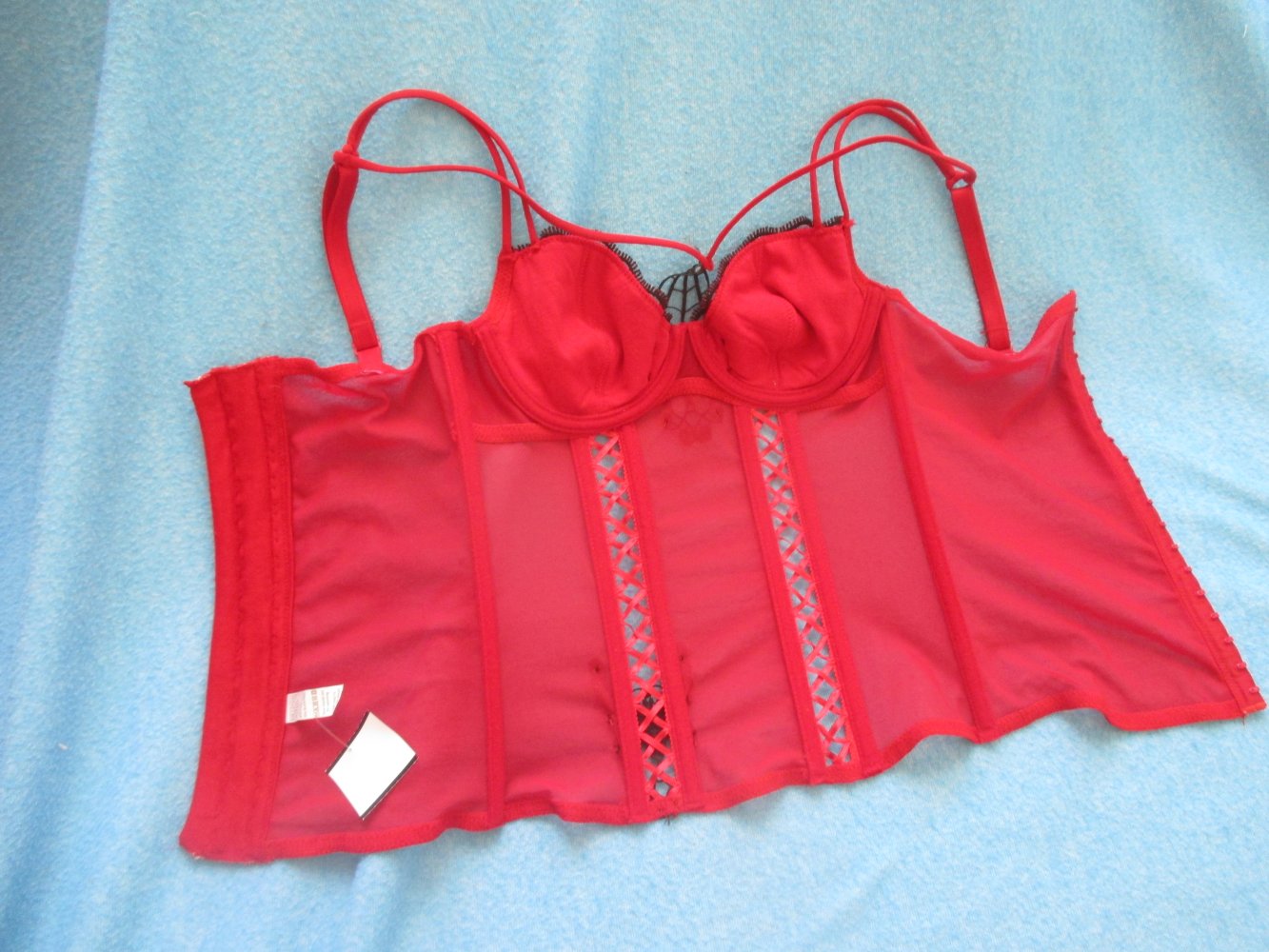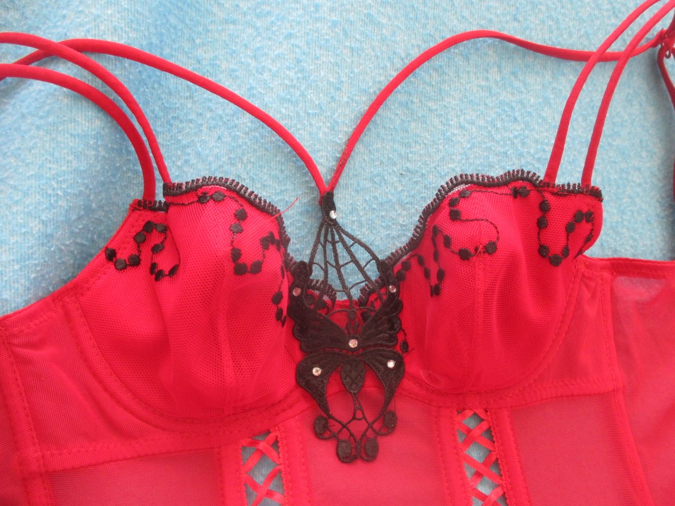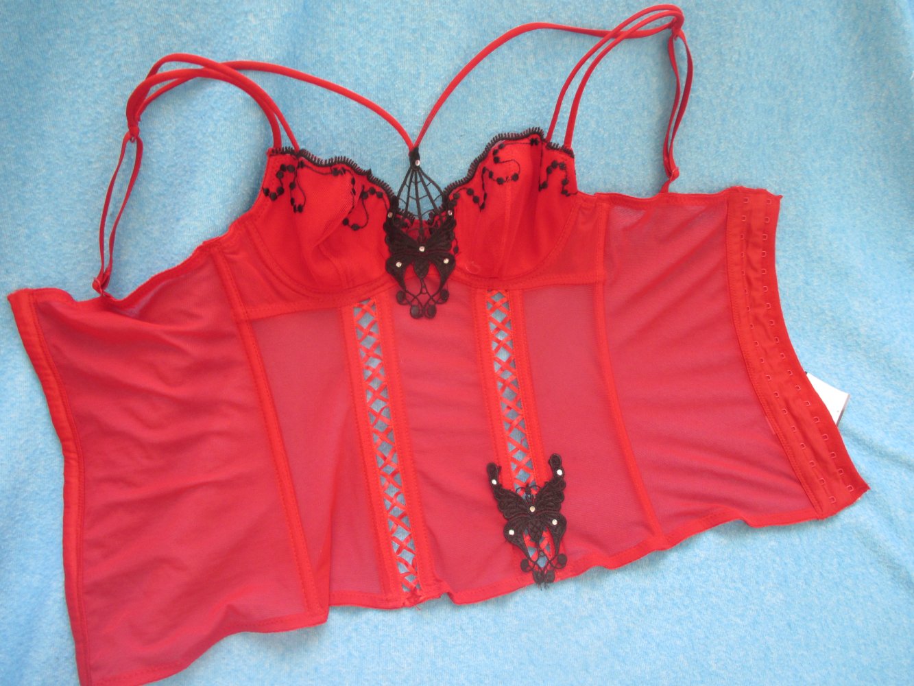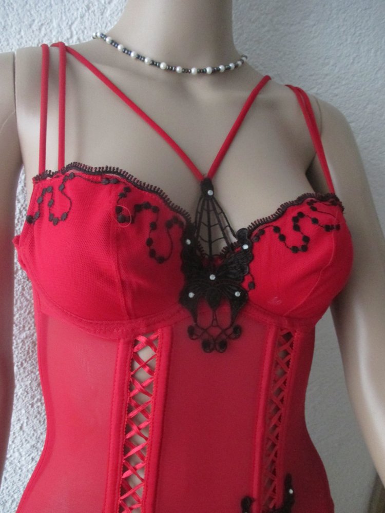NEU mit ETIKETT * Swarovski * Strass- Kristalle * Schmetterling * Butterfly * Applikationen * Mesh * Träger * Bügel- Bustier * Mieder * Corsage * Korsett * Gr. 34- 36/ XS- S * 70A * rot * schwarz *