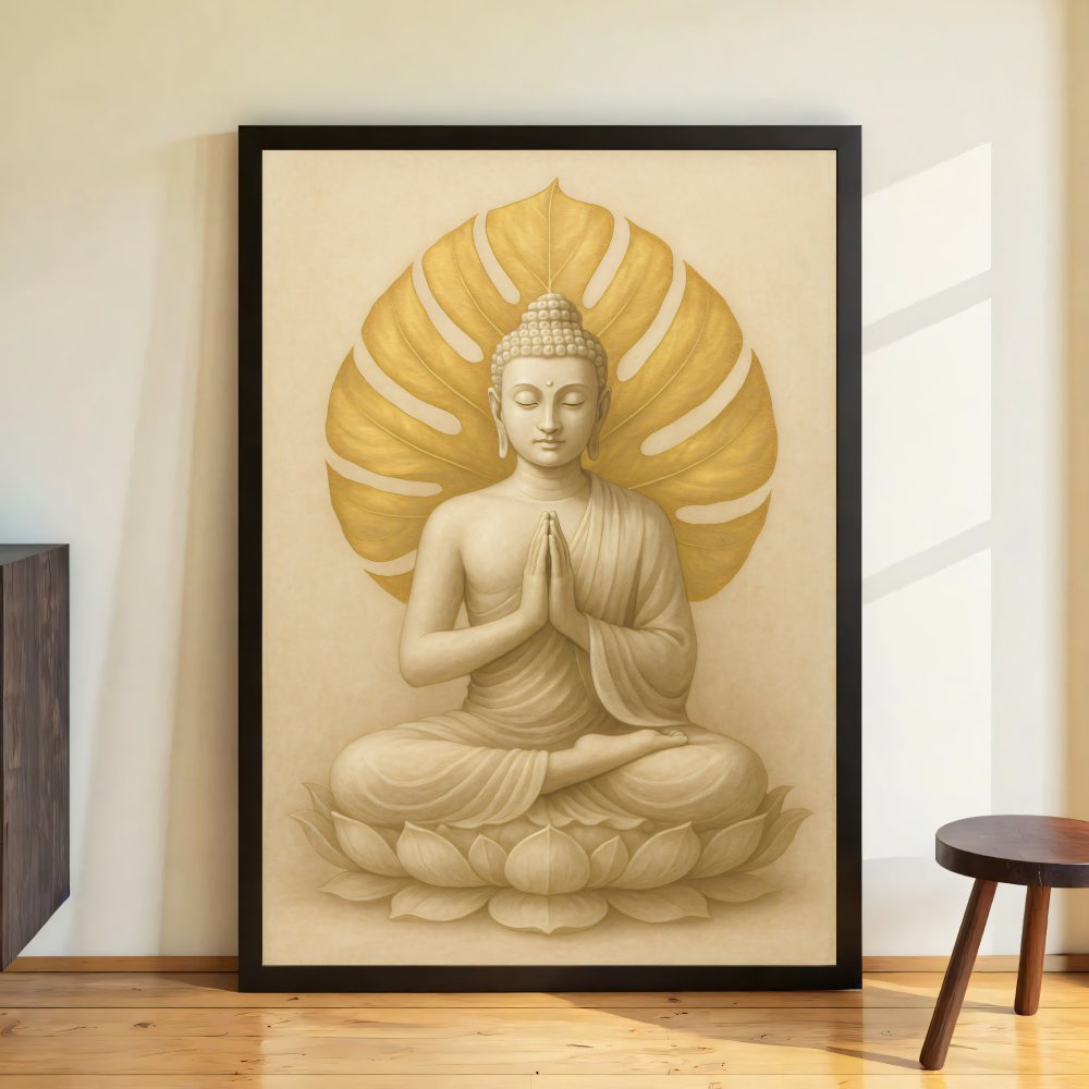 Beruhigendes, spirituelles Digitalposter mit einem meditierenden Buddha vor goldenem Blattmotiv. Die warmen Beige- und Goldtöne schaffen eine harmonische, ruhige Atmosphäre und passen perfekt in Wohnzimmer, Schlafzimmer, Yoga- oder Meditationsraum. Ein zeitloses Motiv für alle, die Achtsamkeit, Ruhe und Ästhetik lieben – auch ideal als Geschenk.