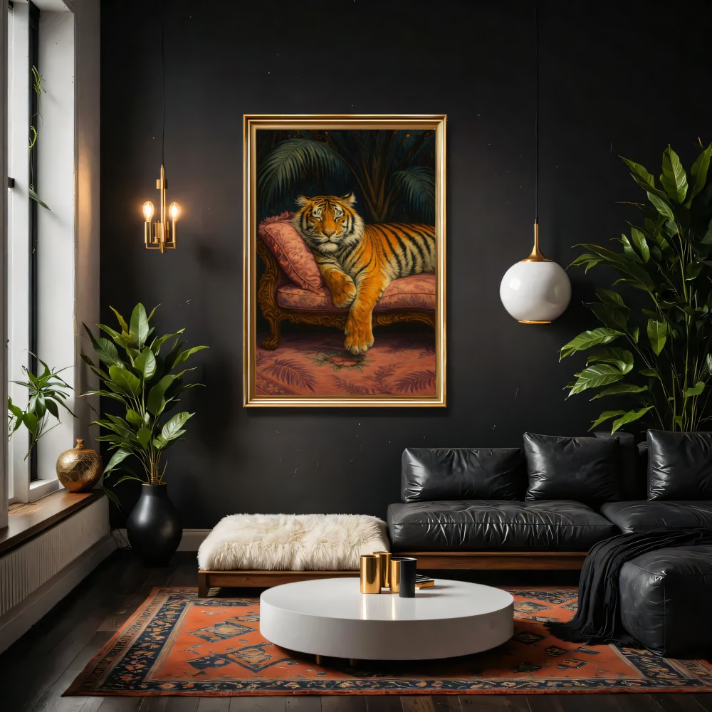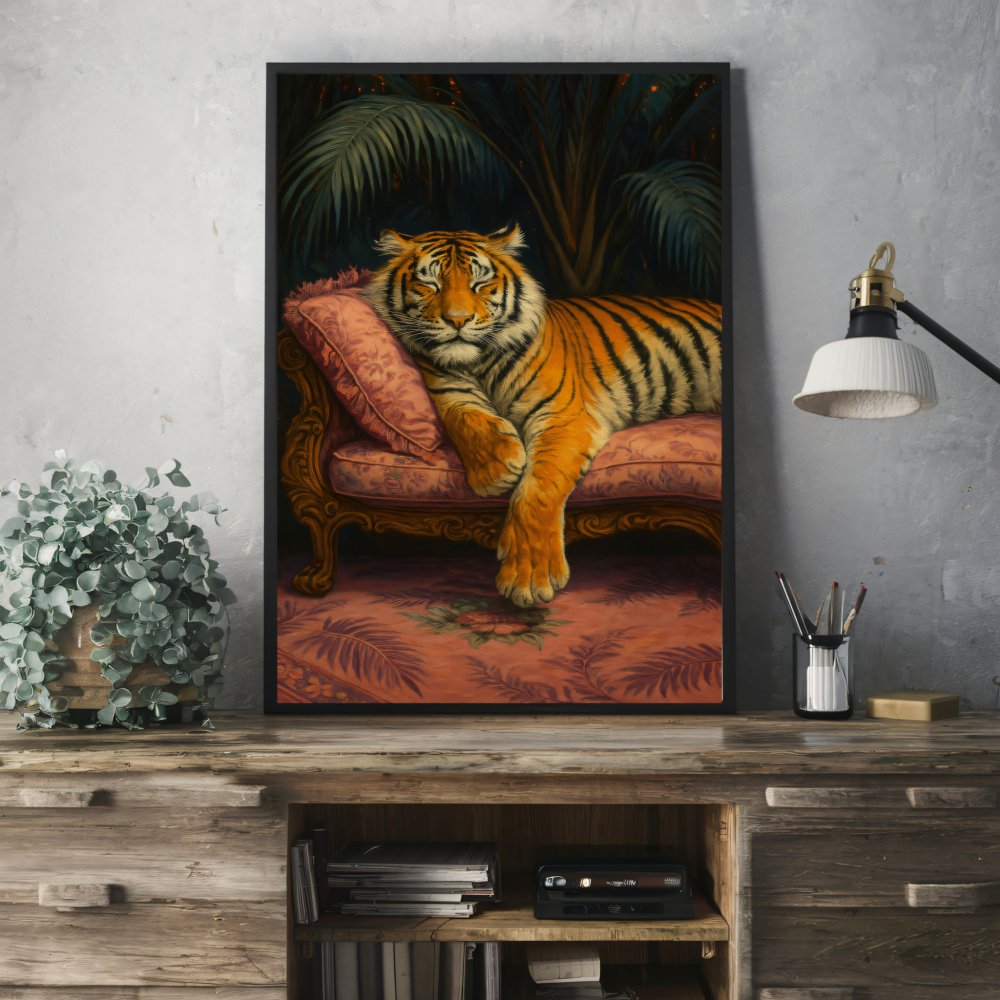 Edles, außergewöhnliches Digitalposter mit einem entspannt schlafenden Tiger auf einem romantischen Vintage-Sofa, umgeben von dunklem Dschungelgrün. Die warmen Orange- und Rosatöne des Tigers und der Polster treffen auf einen geheimnisvollen, tropischen Hintergrund – luxuriös, ruhig und ein echter Blickfang. Perfekt für stilvolle Wohnräume, Schlafzimmer, Boutique-Einrichtungen oder als besonderes Geschenk für Tier- und Kunstliebhaber.