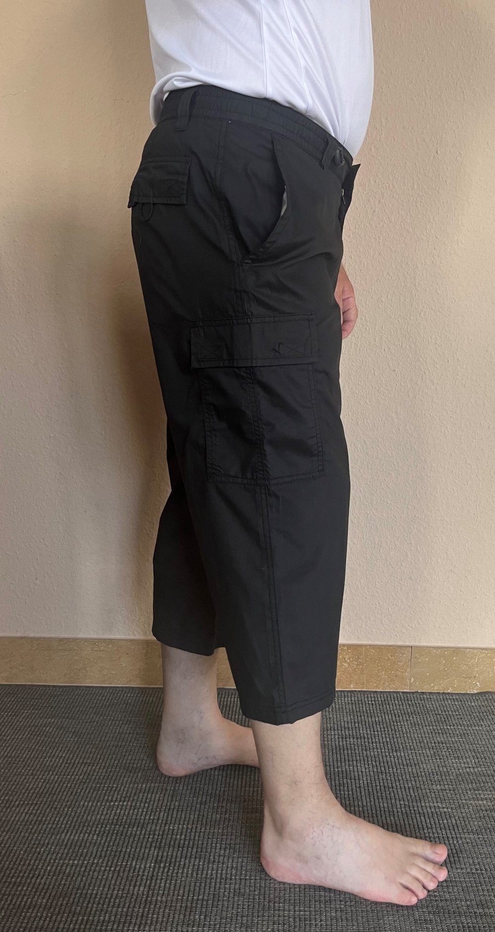 elastischer Bund, 2 Seitentaschen und jeweils 2 Taschen am Oberschenkel. Super bequem und kaum getragen da ich einfach rausgewachsen bin.