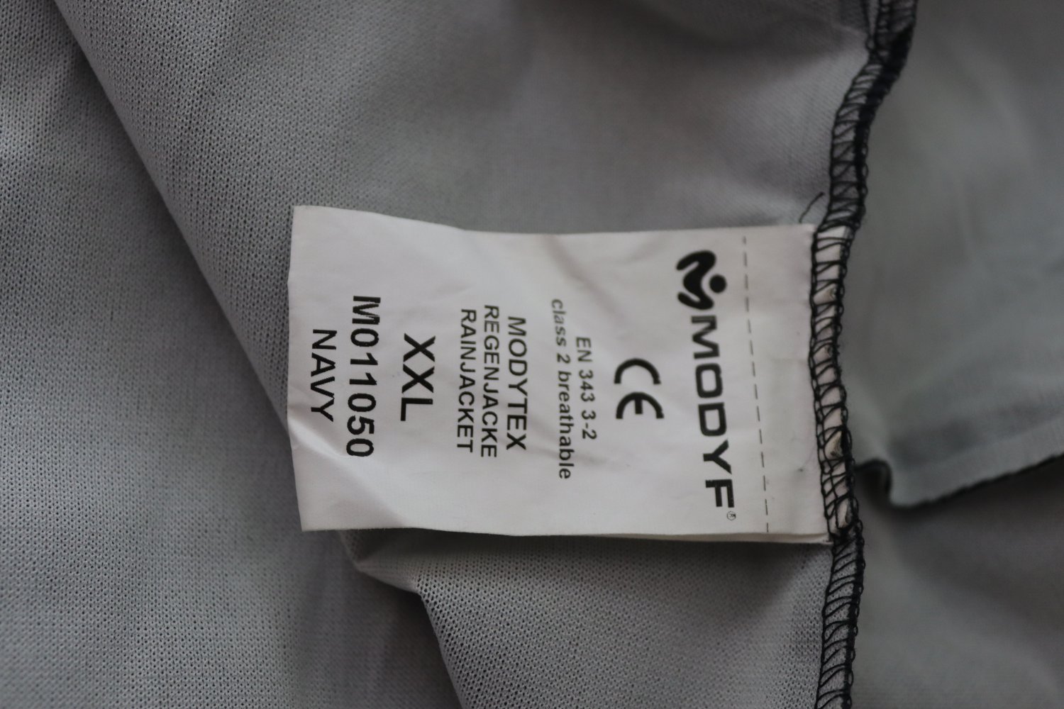 Die elastische Schutzkleidung Regenjacke Modyf EN 343 marine bietet Schutz bei Wind und Nässe. Sie erfüllt die Kriterien der EN 343, Kategorie 3/1. Diese Norm entspricht den Anforderungen der Berufsgenossenschaft hinsichtlich Wetterschutzes auf Baustellen. Die Regenjacke ist bequem durch ihren längeren Schnitt und schützt zuverlässig vor Regen. Dafür sorgt das elastische, wind- und wasserdichte MODYTEX®-Material, das außerdem besonders atmungsaktiv ist. Die Kapuze der Regenjacke ist mit einem Kordelzug verstellbar. Gummizüge an den Ärmelenden schließen dicht ab und ermöglichen eine Weitenregulierung.