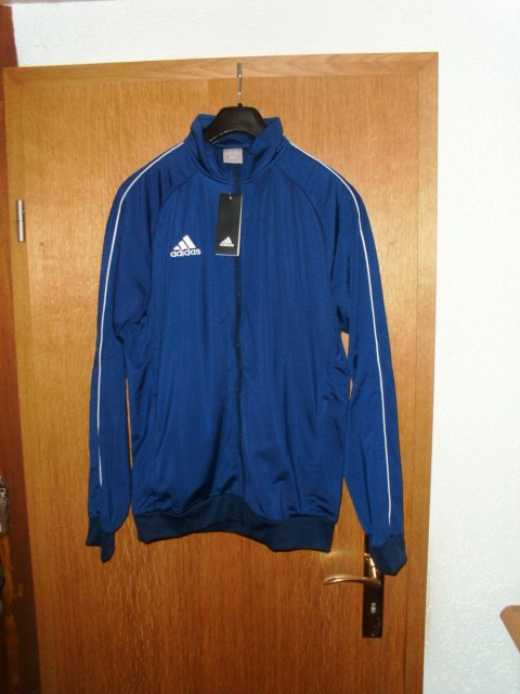 Biete hier eine Trainingsjacke von Adidas in Größe M an. Sie ist dunkelblau-weiß ( sieht auf den Fotos leider heller aus) und hat vorn einen durchgängigen Reißverschluss. Außerdem hat sie von zwei Taschen mit Reißverschlüssen. Die Jacke ist neu, ungetragen und noch original verpackt mit Etiketten. Sie wurde nur zum Fotografieren herausgenommen. Die Jacke ist passend zu der Hose die ich hier auch anbiete, hat die selbe Farbe.