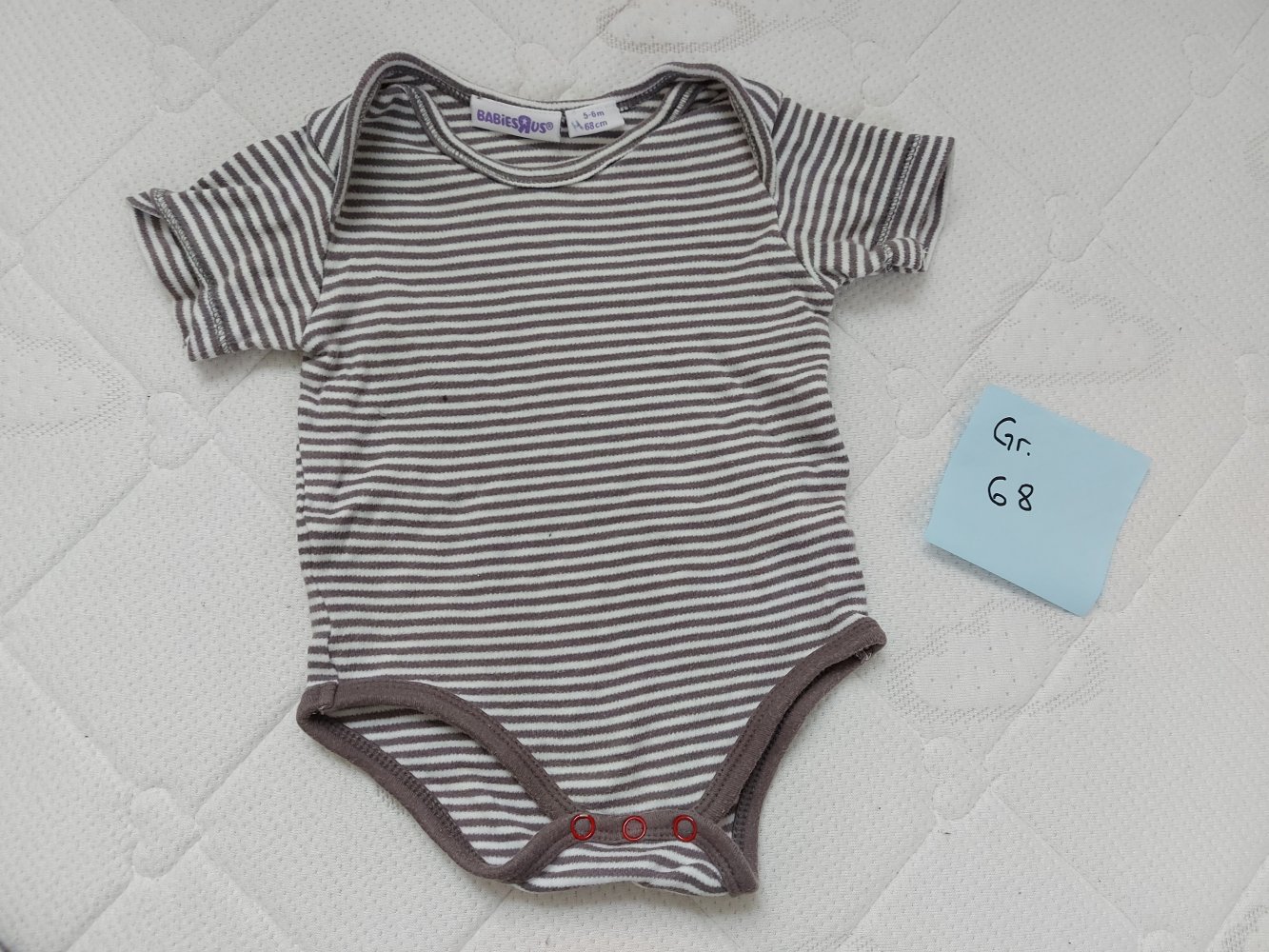 Grau-weiß gestreifter Kurzarm-Body in Gr. 68 mit dehnbarem amerikanischen Ausschnitt.