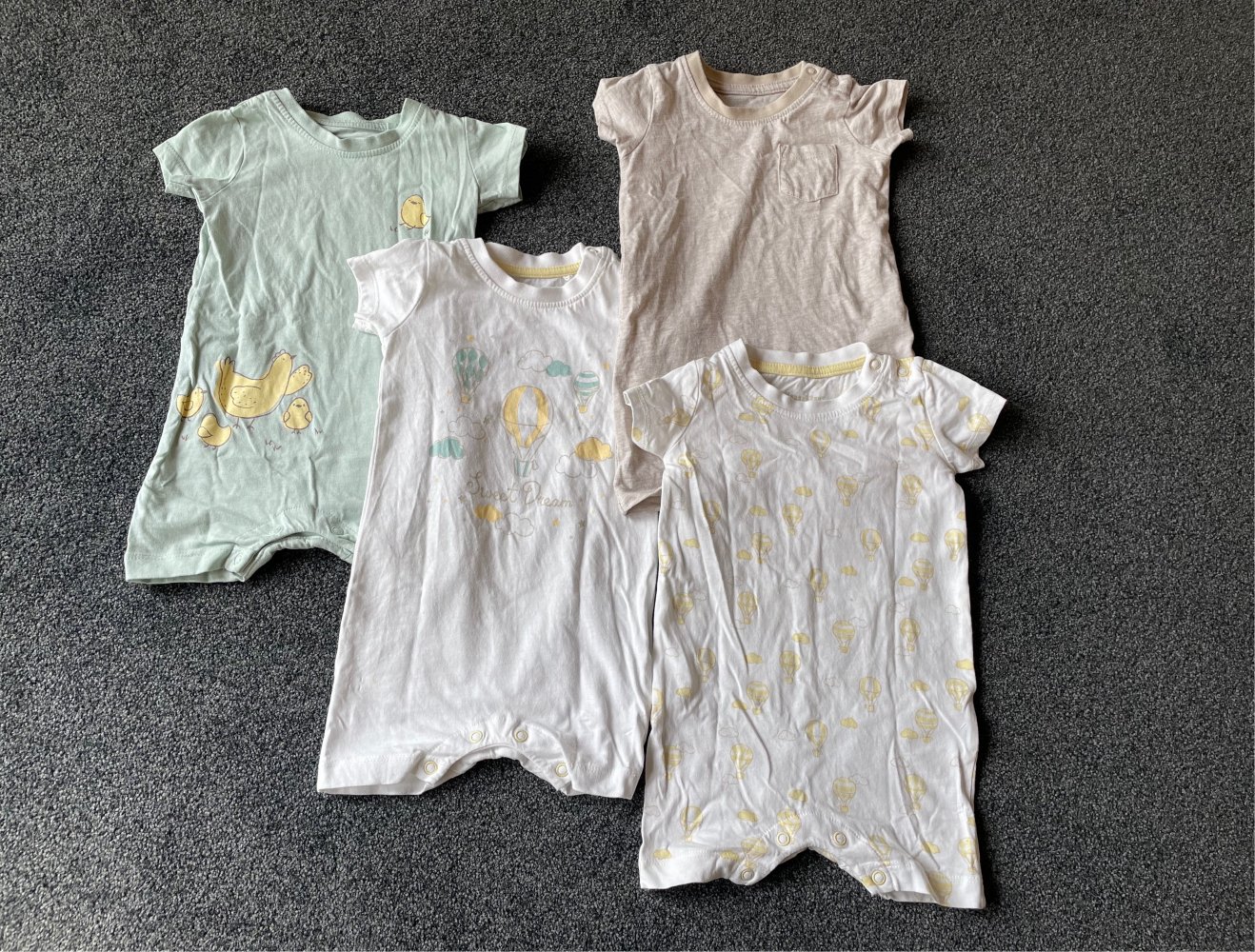 4 super süße kurze Schlafanzüge mit Knopfleiste im Schritt und Hals. Nur einmal gewaschen und leider nie getragen, da mein kleiner schon vor dem Sommer zu groß war. Verkauf nur im Set.