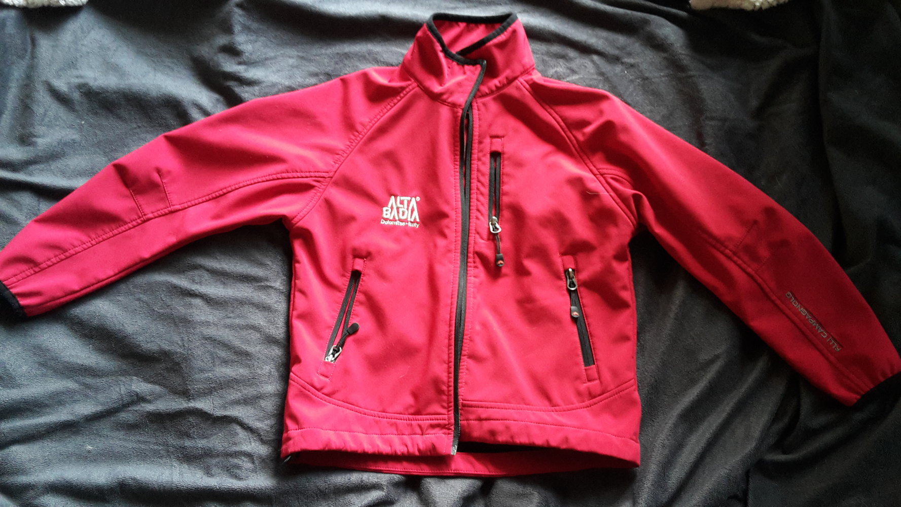 Winddichte Softshelljacke in tiefem Rot (also nicht so knallig wie auf den Fotos). Wurde von einem Jungen getragen, ist also "männertauglich".
