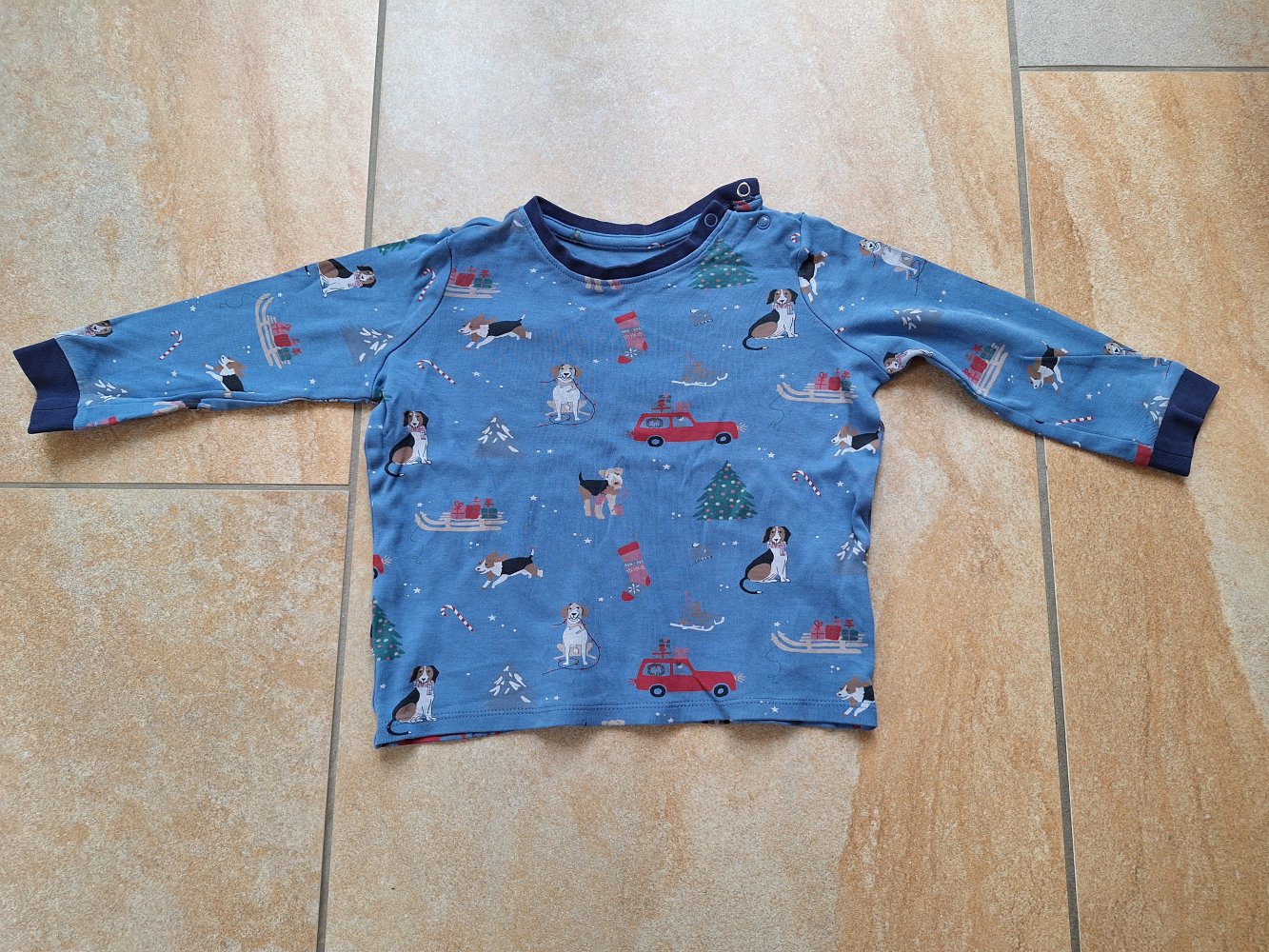 Sehr niedlicher blauer Weihnachtspullover mit Hunden und Weihnachtsmotiven, Gr. 86/92 aus 100 % Baumwolle.