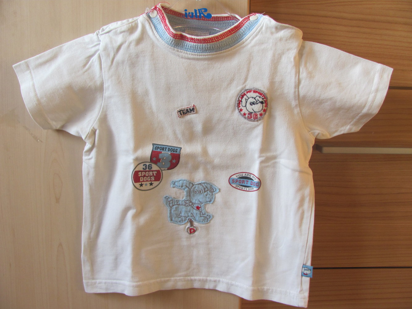 verkaufe hier ein weißes T-Shirt in der Größe 86, das T-Shirt hat über Aufdruck Sport Dogs einen ca. 1 cm großen verblassten orangenen Fleck, er ist beim Waschen nicht herausgegangen, T-Shirt hat keine Löcher