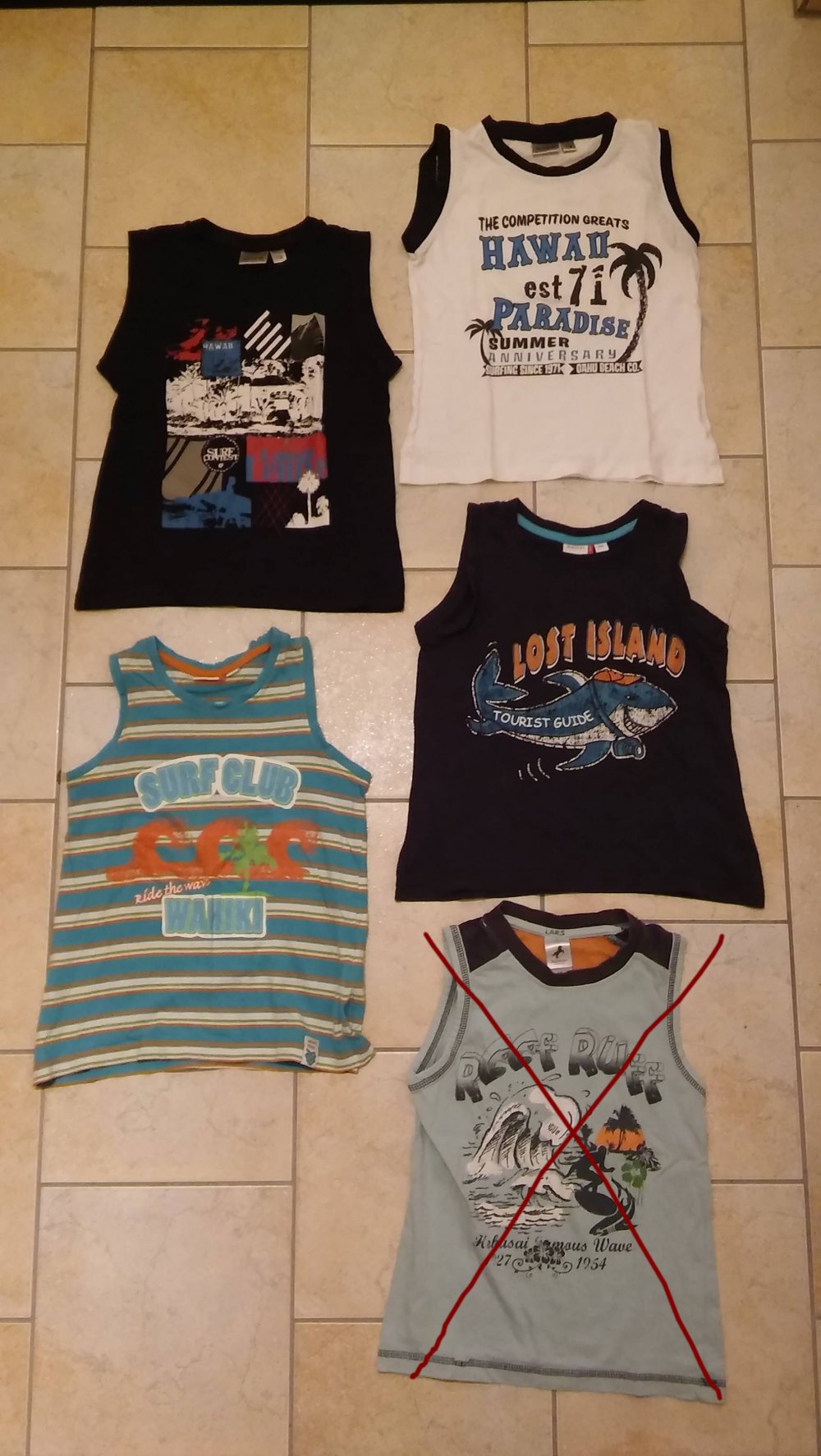 Diese vier ärmellosen Shirts haben die Größe 116 und sind verschiedene Hersteller: