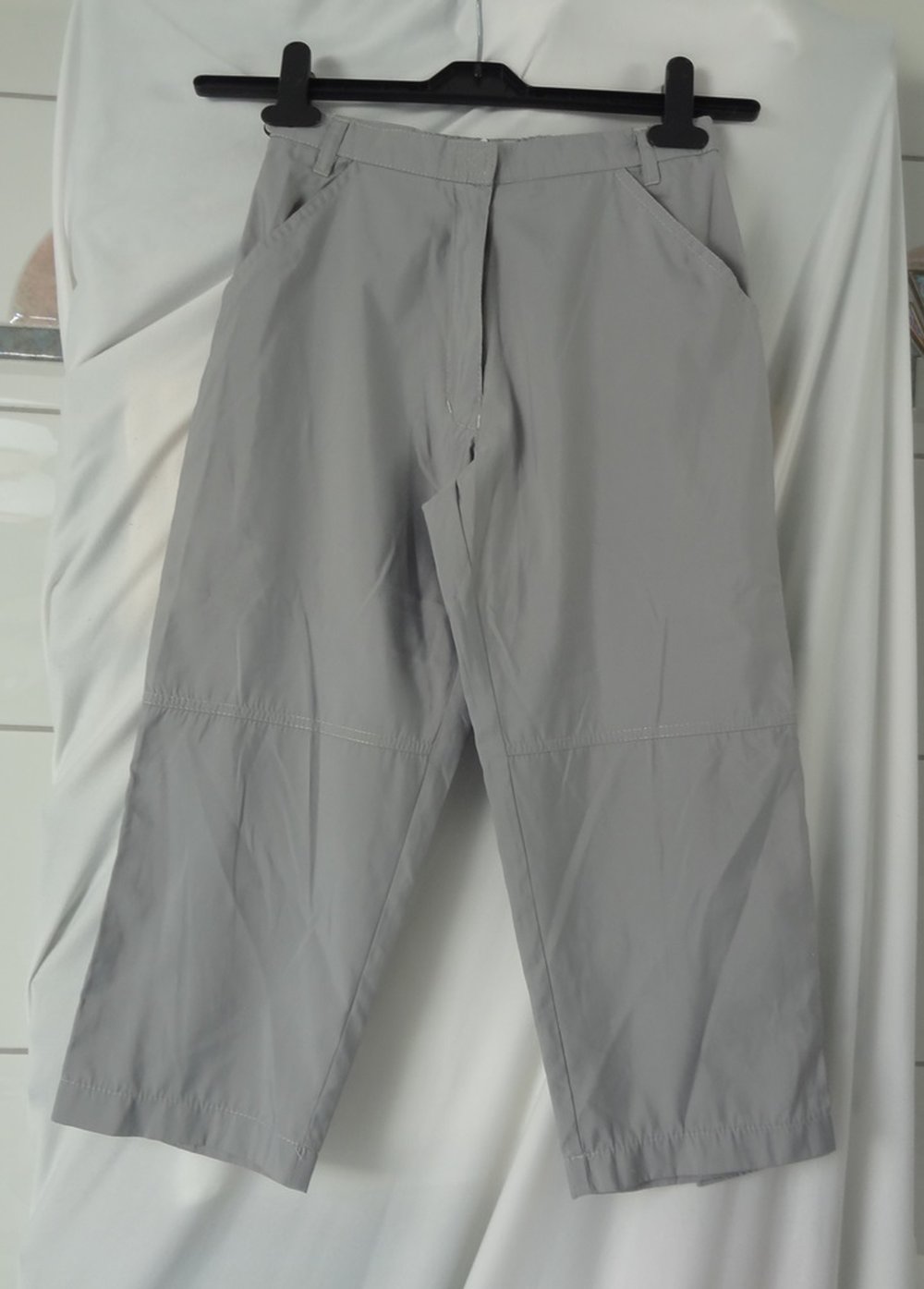 Leichte graue Stoffhose in Größe 152. Sie hat Zwei Vordertaschen und wird mit einem Klettverschluss und einem Reißverschluss geschlossen. In ca. Kniehöhe hat sie eine Naht. Sie hat Gürtelschlaufen. Auf der Rückseite an den Beinenden hat sie auf jeder Seite ein Bändel mit einem Klettverschluss, womit man die Enden etwas enger machen kann. Sie hat eine dazupassende Bauchtasche, die man mit einem Klettverschluss hin- oder abmachen kann. Man kann die Bauchtasche nach vorne oder hinten hängen lassen.
