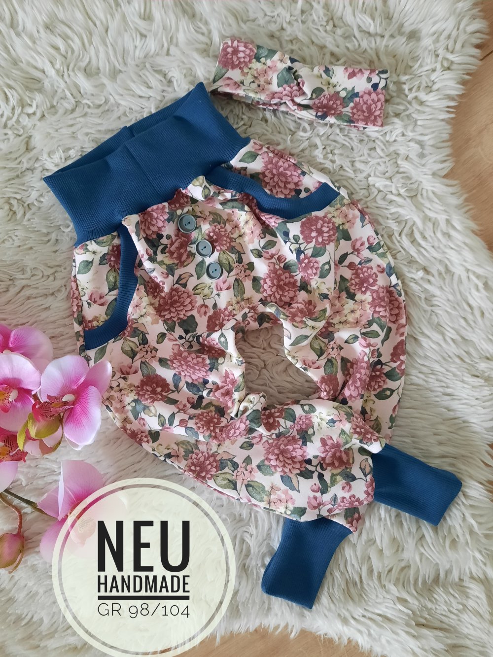 Neu handmade Mädchen Pumphose Blütentraum & Bandeau Stirnband 98/104