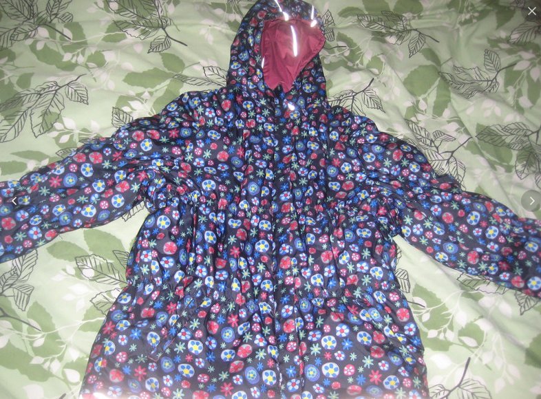 Tolle Jako-o Winterjacke tailliert mit Steppnähten, Kapuze, zwei Eingrifftaschen, hinten an der Kapuze und unten am Saum Reflektoren, Blau mit bunten Blumen, lila farbenes Innenfutter. Gr. 140/146, Maße: Achsel-Achsel: 49 cm, Länge: 65 cm, Ärmellänge 55 cm