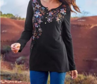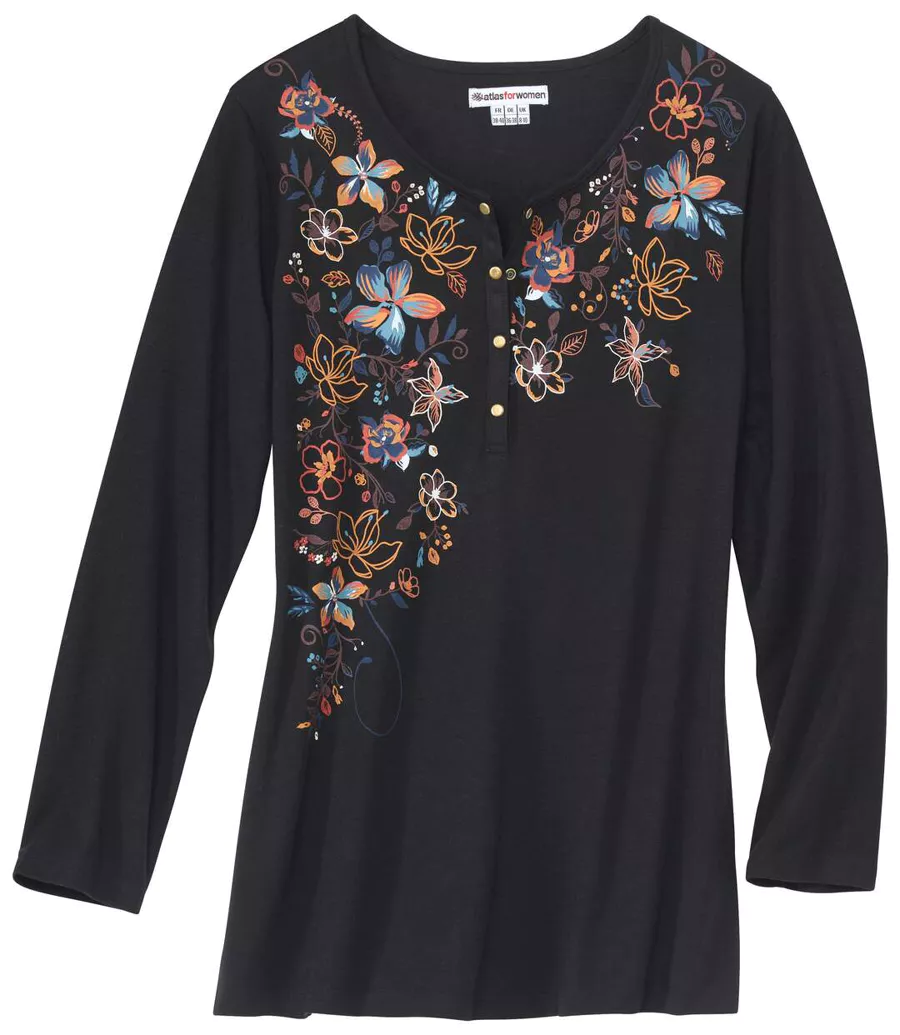 Damen Tunika Langarmshirt schwarz Blumen-Dekor Knopfleiste Gr. 48 50 52 XXL