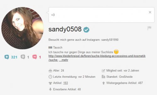 sandy0508 Stadt : Hannover - Deutschland Letzte Aktivität : 21.04.2015 Mitglied seit : 24.10.2014 Besucher : 11317